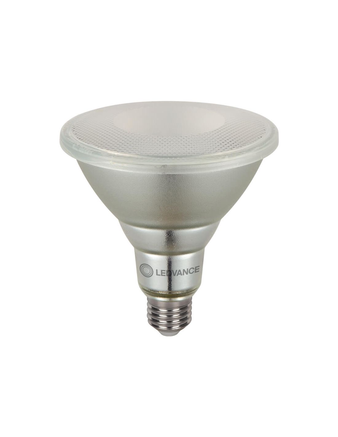 Lâmpada LED LedVance Performance Class PAR38 com potência de 13,5W equivalente a mais de 120W, intensidade de 1035Lm (2.500cd) e tom de luz quente de 2700K. Lâmpada LED válida para instalação externa, IP65 e ângulo de feixe luminoso de 30º, Faixa de performance com 4 anos de garantia e 25.000 horas de vida útil.