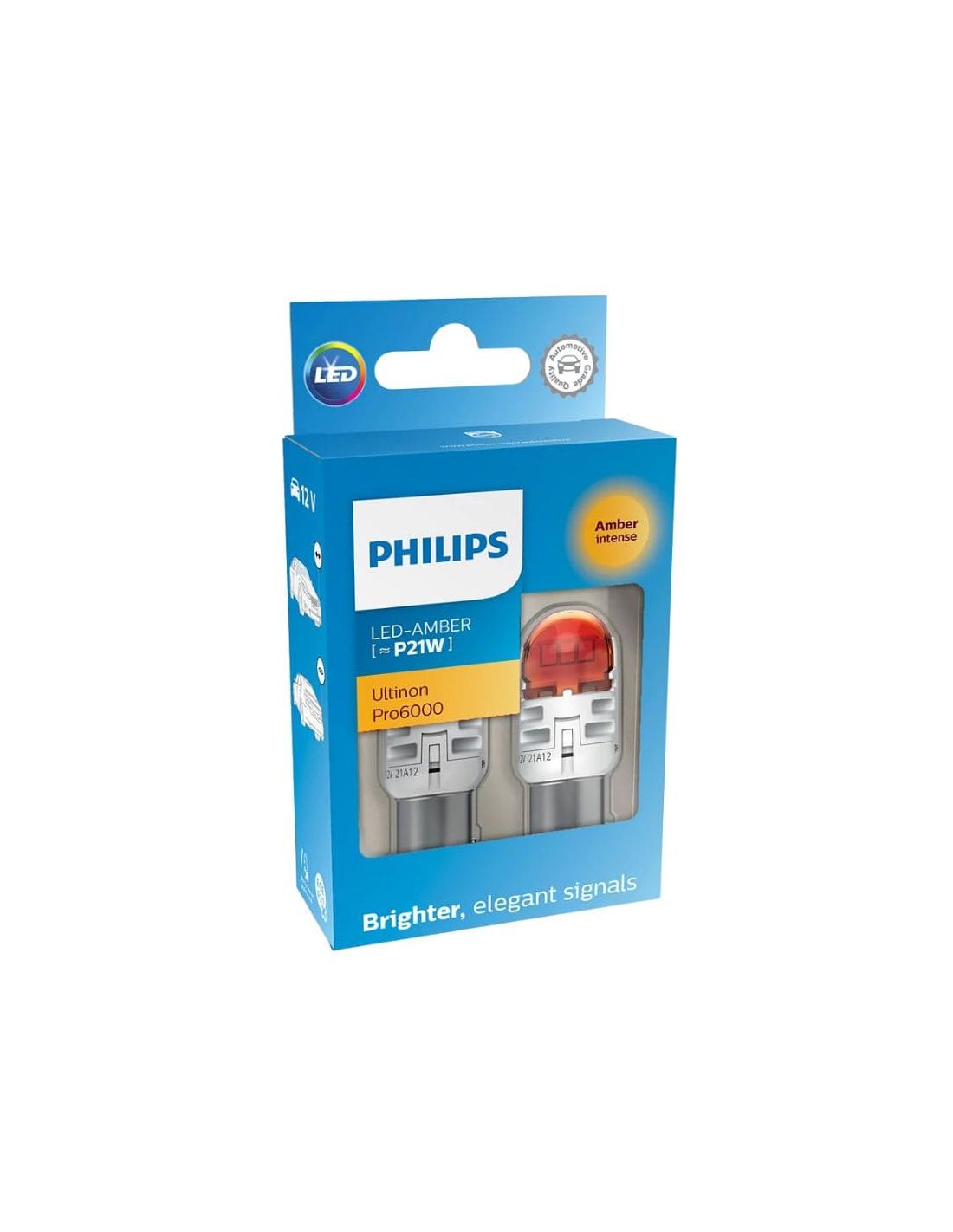 Marca: Philips. Linha: Ultinon Pro6000. Referência: 11498AU60X2. Tecnologia: LED automotivo. Tipo de lâmpada: LED P21W. Base/Soquete: BAU15S. Voltagem: 12V. Potência aproximada: 2W. Cor da luz: Âmbar. Fluxo luminoso: 80 lm. Vida útil: Até 5000 horas. Aplicação: Piscas dianteiros ou traseiros. Instalação: Plug & Play. Homologação ECE: Não. Conteúdo da embalagem: 2 lâmpadas LED Philips Ultinon Pro6000.