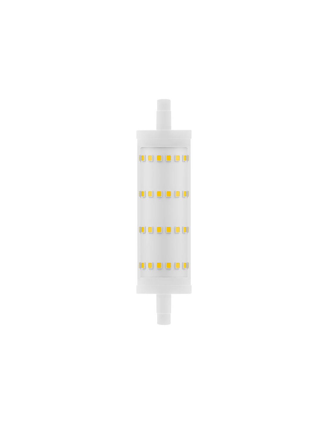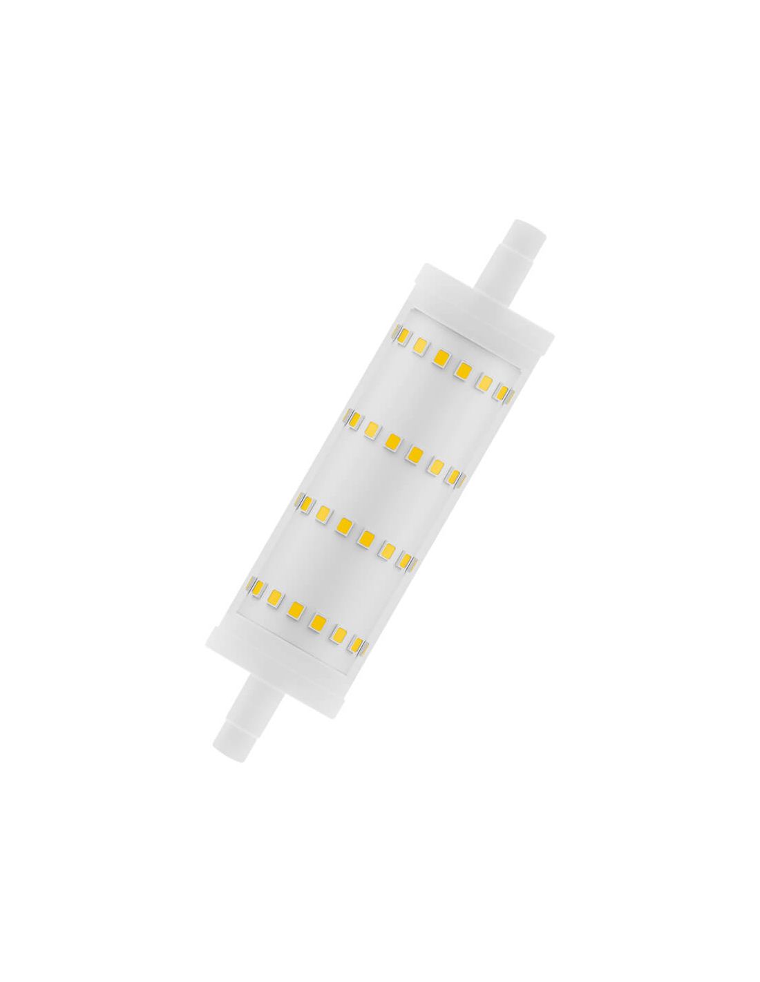 Lâmpada LED Linear R7S da marca LedVance com potência de 13W, Intensidade Luminosa de 1521Lm e temperatura de cor de 2700K (Branco Quente), seu Comprimento é de 119mm e diâmetro de 2,8Cm.