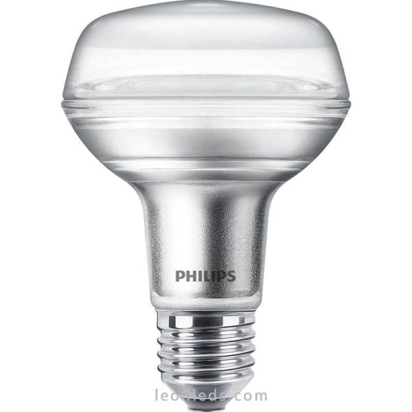Potente lâmpada LED R80 da marca Philips em formato R80 Reflector com rosca E27, uma potência de 8W equivalente a 100W, uma intensidade luminosa de 670Lm e um tom Warm Light de 2700K.