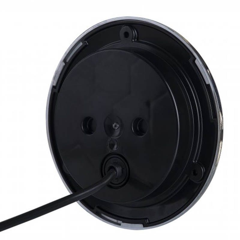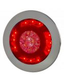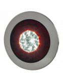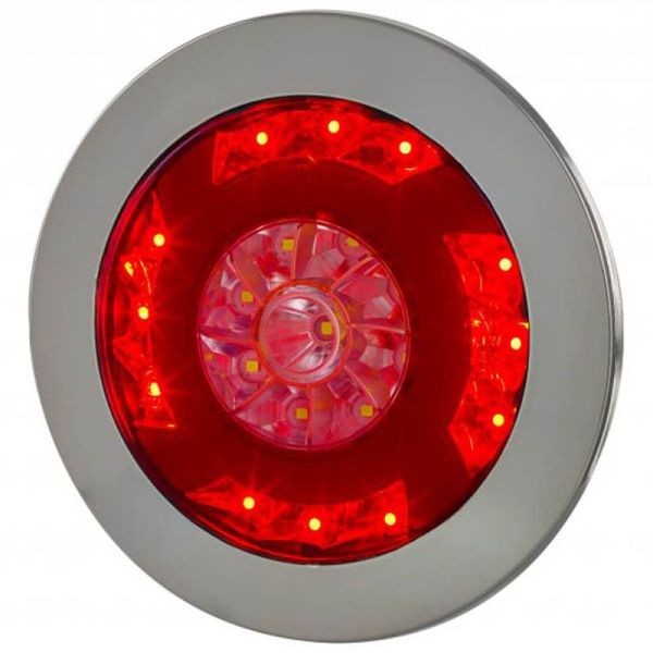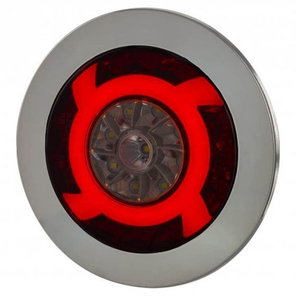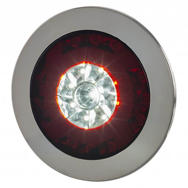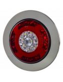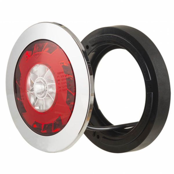 Lanterna traseira redonda em LED com acabamento cromado com 3 funções, Neon, Fog e Reverse Effect Position, válida para 12V e 24V. Pode ser instalado encastrado ou à superfície, inclui argola para instalação à superfície e cabo de 1,5 metros para a sua instalação.