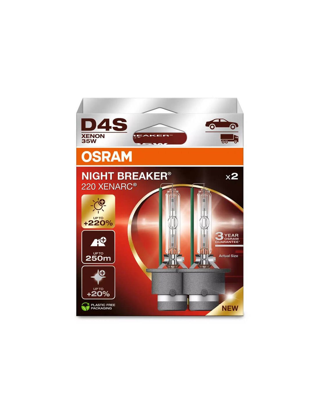 Novo Pack de 2 Lâmpadas Xénon D4S (P32d-5) da marca Osram, modelo Night Breaker 220 Xenarc , é uma lâmpada perfeita se procuramos até 220% mais intensidade luminosa e mais luz branca. Ele vem em uma caixa de papelão Plastick Free. Luz 20% mais branca, mais de 220% de luminosidade e luz 20% mais branca.