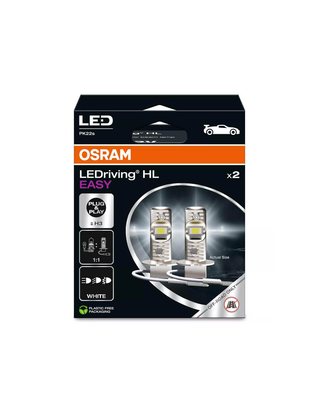 Lâmpadas LED H3 Osram HL EASY com referência 64151DWESY, tonalidade de Luz Branca Fria 6500K com intensidade de 900Lm e potência de 8W, é mais brilhante que as Lâmpadas Halógenas convencionais, Lâmpada válida para luz curta, longa ou de nevoeiro, válida para H3 sem trocando a bucha. Nova linha Osram, sem necessidade de adaptadores ou tampões de borracha, instalação igual a um H3 Halogênio.