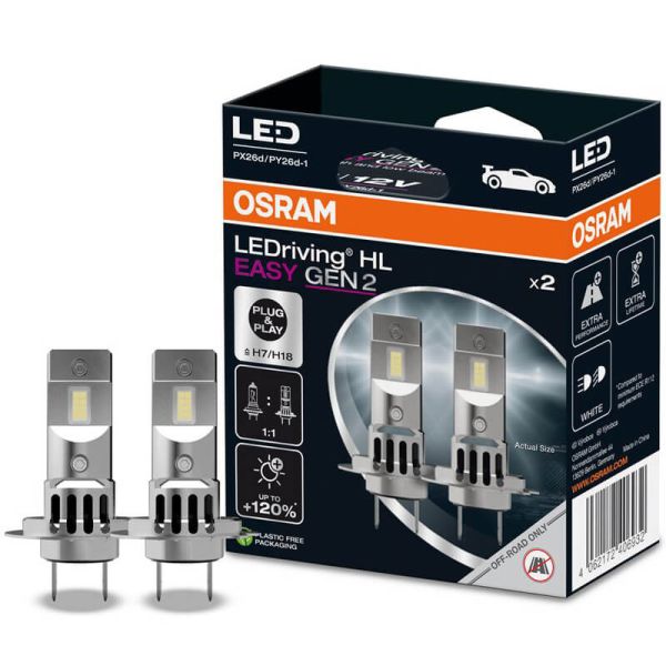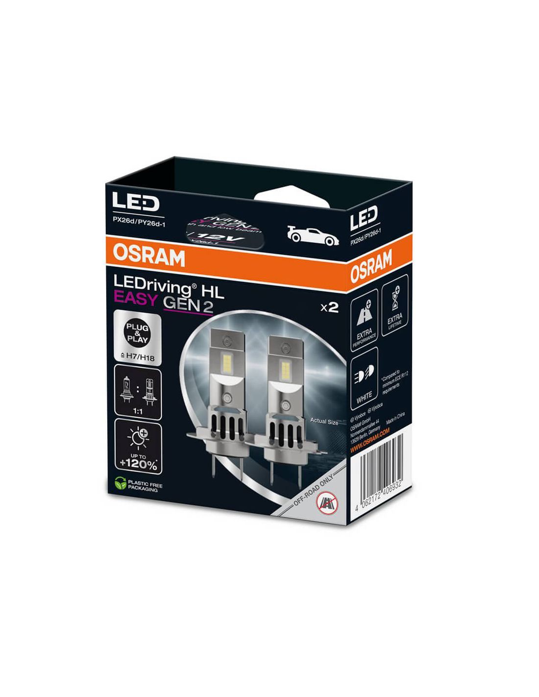 Lâmpadas LED H7 / H18 Osram HL EASY Gen 2 com referência 64210DWESY2, tonalidade de Luz Branca Fria 6500K com intensidade de 2.000Lm e potência de 16W, é mais brilhante que as Lâmpadas Halógenas convencionais, Lâmpada válida para curto ou longo prazo, válida para H7 e H18 sem troca de bucha. Nova gama Osram Gen 2, sem necessidade de adaptadores ou tampões de borracha.