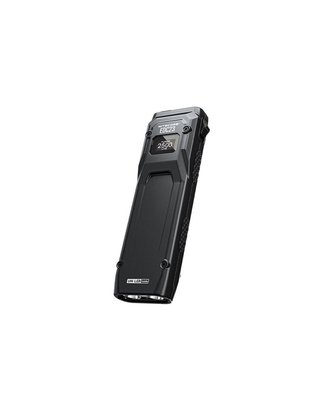 Lanterna de bolso plana EDC23 com tela OLED e 2.500 lúmens de potência. Design compacto e recarregável via USB-C , ideal para atividades ao ar livre e uso diário. Alcance de até 280 metros e resistência à água e poeira com certificação IP54 .