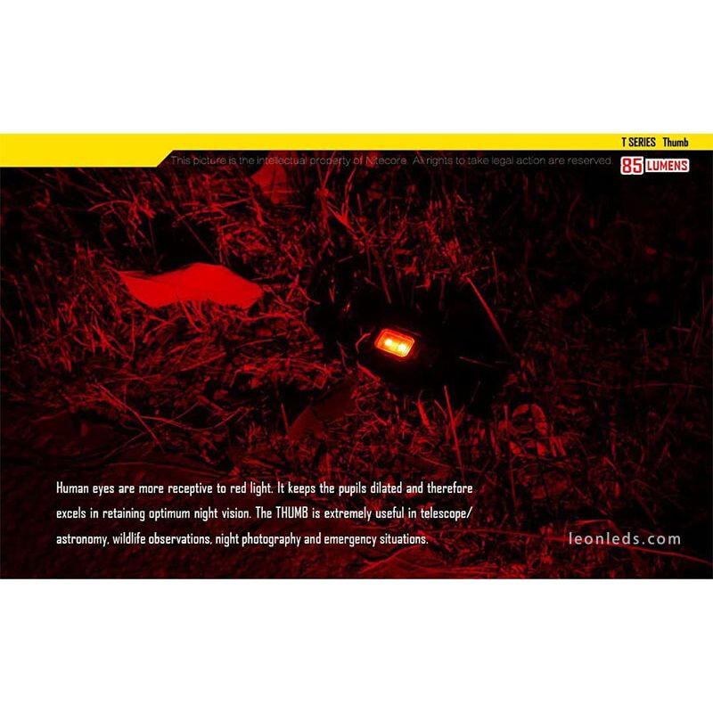 Lanterna chaveiro recarregável Nitecore 85 lúmen Thumb LED com luz ajustável de 120º. Esta lanterna é feita de policarbonato, tem uma potência de 85 lúmens e um alcance de 26 metros. Inclui 2 LEDs frontais com 3 níveis de potência e 3 LEDs laterais vermelhos e azuis.