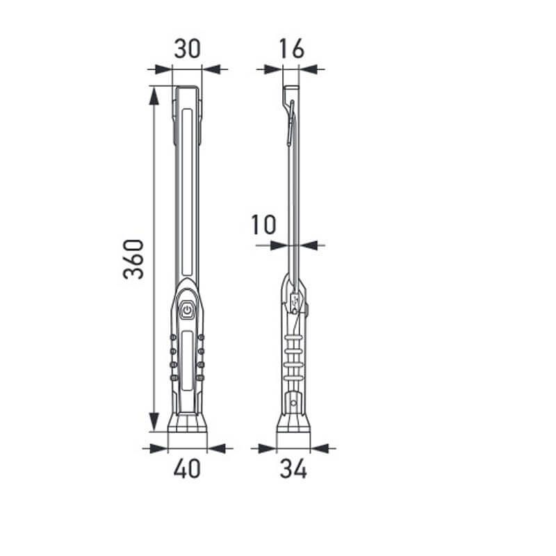 A Lanterna LED estreita inclui Front light e Top light (3W COB - 2 X 0,1W) possui base magnética que gira 90º para direcionar a luz para a área desejada, resistente a impactos e muito leve, pesa apenas 152 gramas. Ele inclui um cabo de carregamento Micro-USB e sua bateria de íons de lítio incluída é de 3,7 V e 2000 mAh. Tem as seguintes dimensões: 3 cm de altura, 36 cm de comprimento, 1,6 cm de largura. A duração da bateria é de 3 horas na potência máxima, 5 horas no nível 1 e 7 horas na luz superior, seu tempo de carregamento é de no máximo 4 horas.