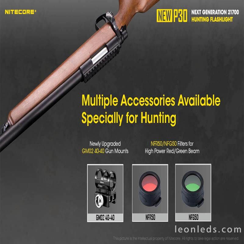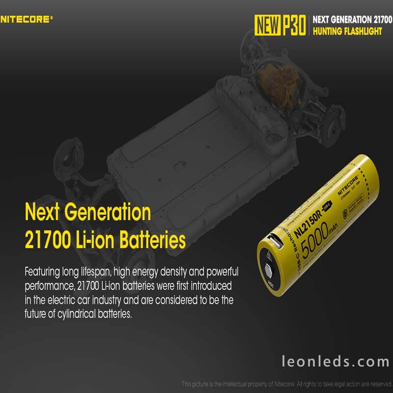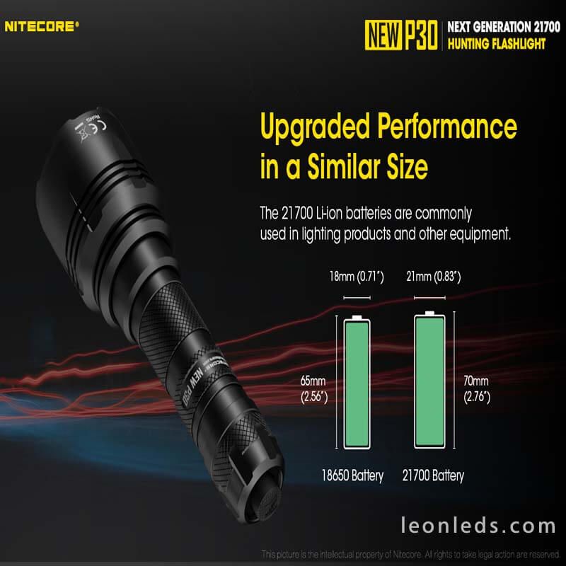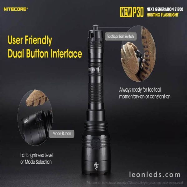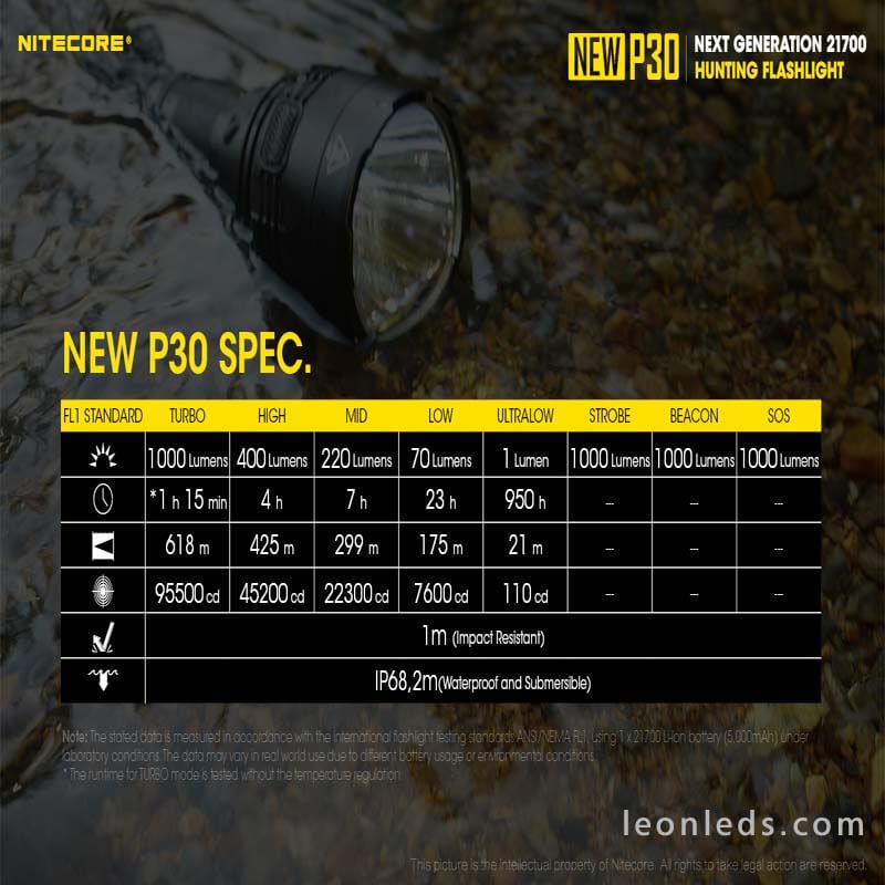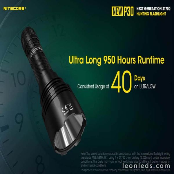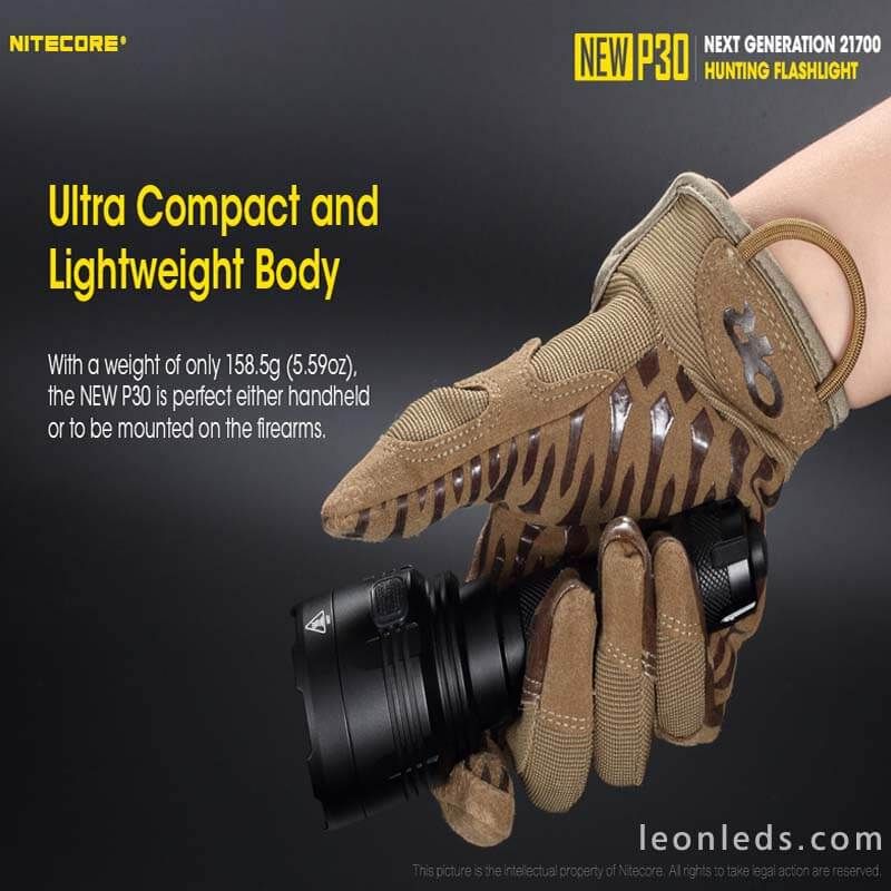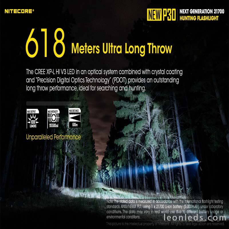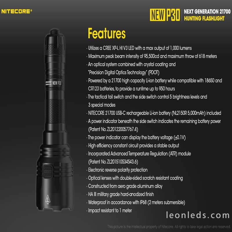 Nova lanterna Nitecore P30 LED de longo alcance com intensidade luminosa de 1000Lm e 95.500 candelas com um alcance de 618 metros, a nova Nova P30 inclui uma bateria de 5000mAh que oferece uma autonomia máxima de 950 horas e uma autonomia em modo turbo de 1 hora e 15 minutos, oferece 5 modos de energia e 3 modos especiais. A bateria é carregada através de um conector USB-c, o conector a incorpora na própria bateria.