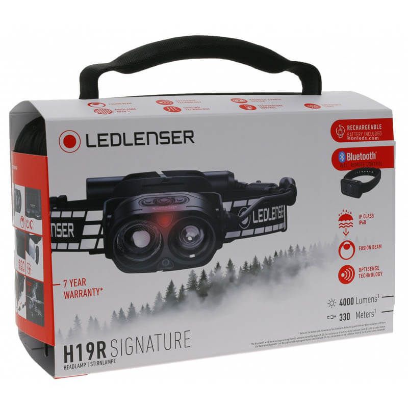 Potente e recarregável farol LED H19R Signature da marca LedLenser que oferece uma potência máxima de 4.000Lm Boost, uma autonomia de bateria de 3,5 horas no modo "Máximo" e uma duração máxima da bateria de até 20 horas no modo Mínimo, seu tempo de carregamento é apenas 330 minutos. A intensidade e o botão liga/desliga estão localizados na lateral da frente e incluem dois LEDs na frente, ótica multicore. Inclui luz LED vermelha para visão noturna.