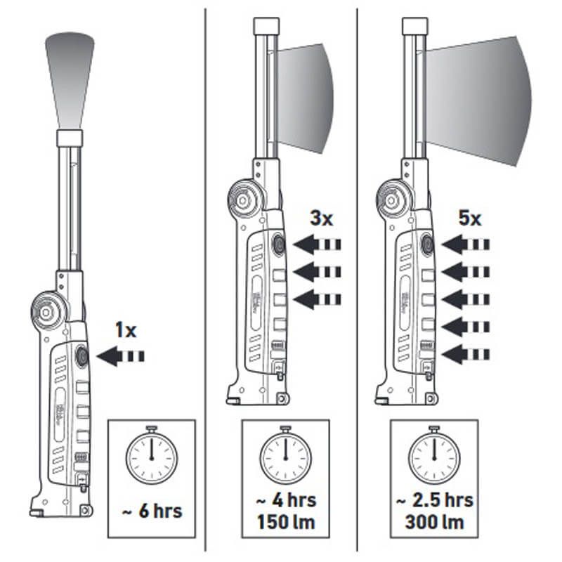 O Hella UPS300 Value Fit também vem equipado com um prático holofote para iluminar áreas difíceis de ver. O poderoso holofote no topo da lâmpada oferece 150 lúmens a 1 W, para que se possa ver os mais pequenos detalhes mesmo na escuridão extrema. Também possui um íman no fundo e um gancho, o que lhe permite montar facilmente a lâmpada em qualquer superfície metálica próxima, como debaixo do lavatório ou no capô do seu carro. Inclui também um indicador de carga luminosa.