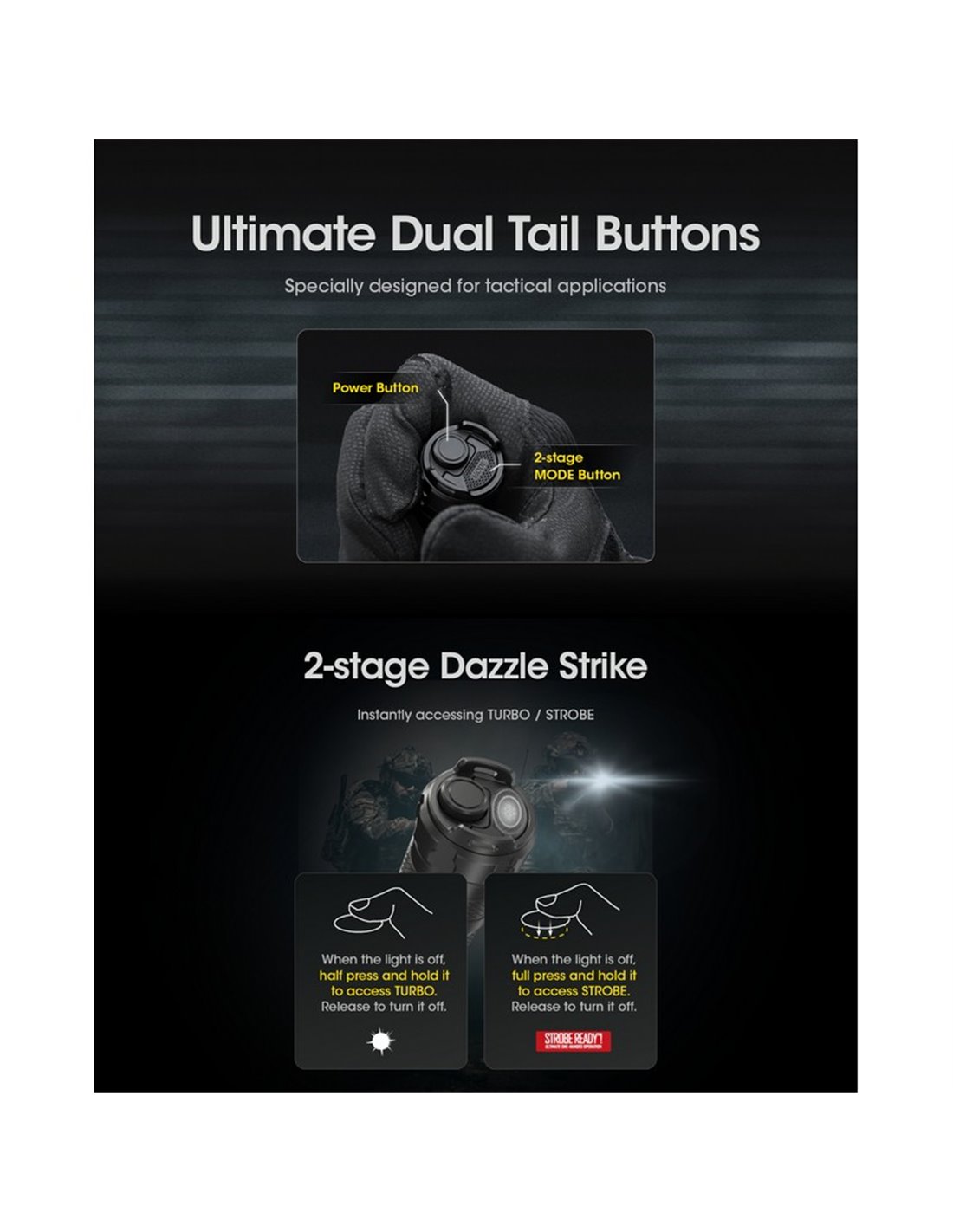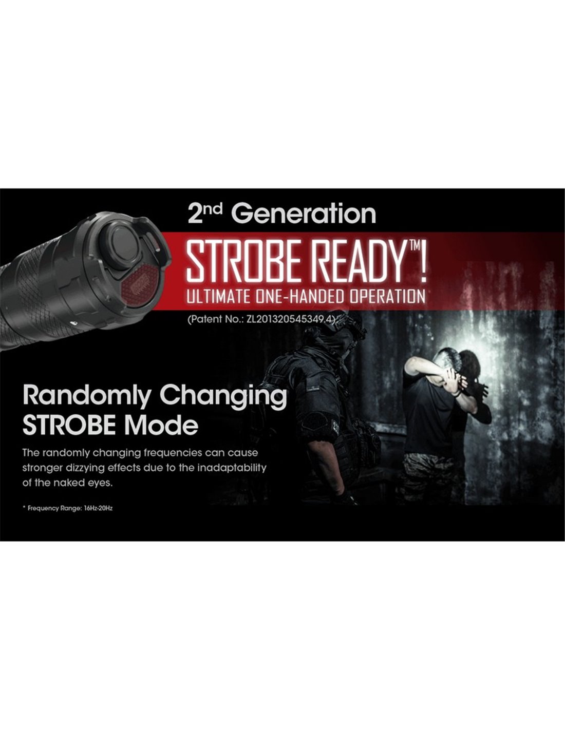 - Modo estroboscópico com tecnologia STROBE READY para acesso rápido ao efeito desorientador.