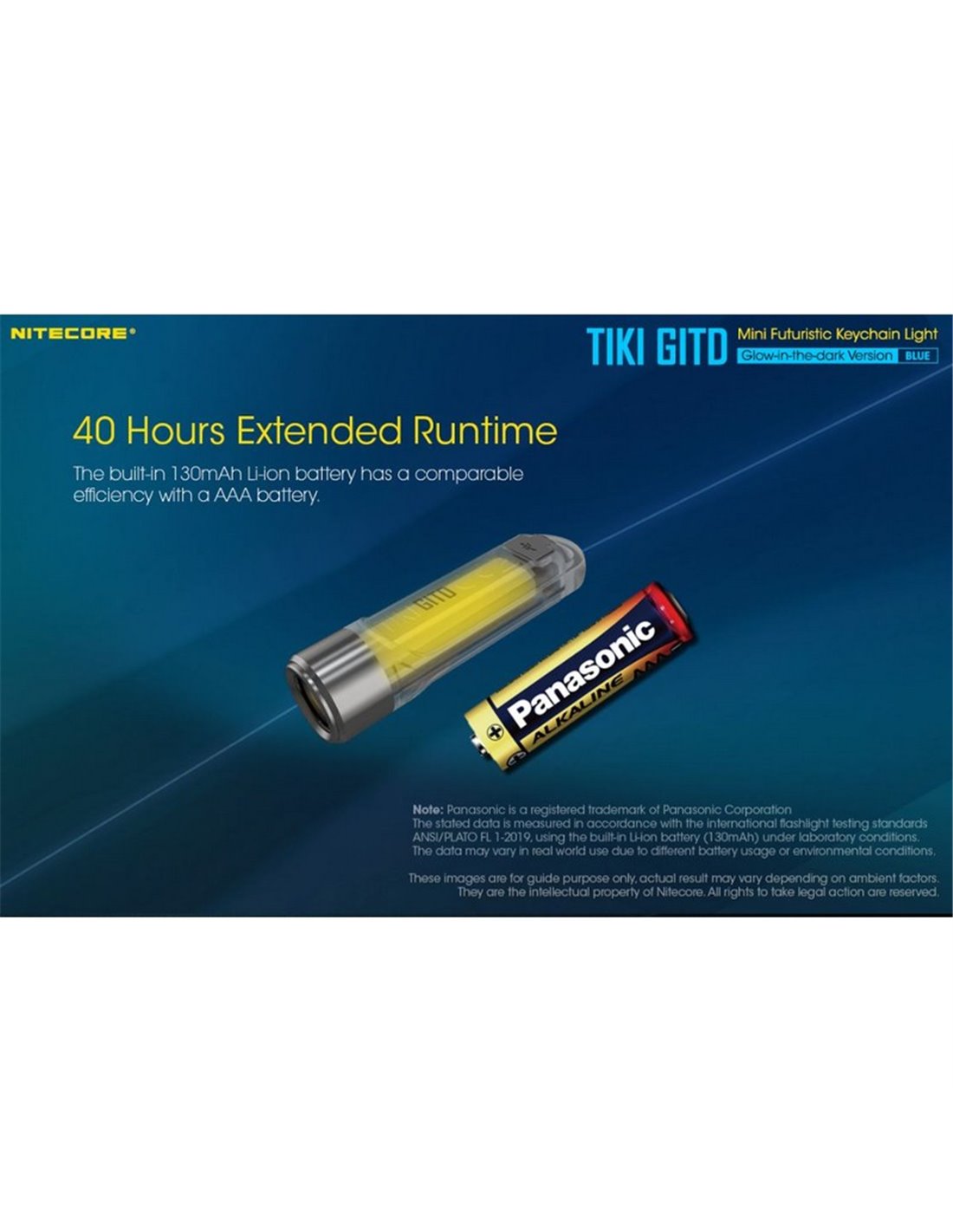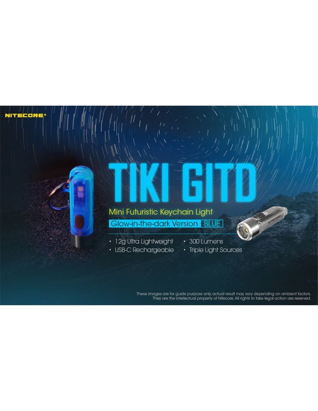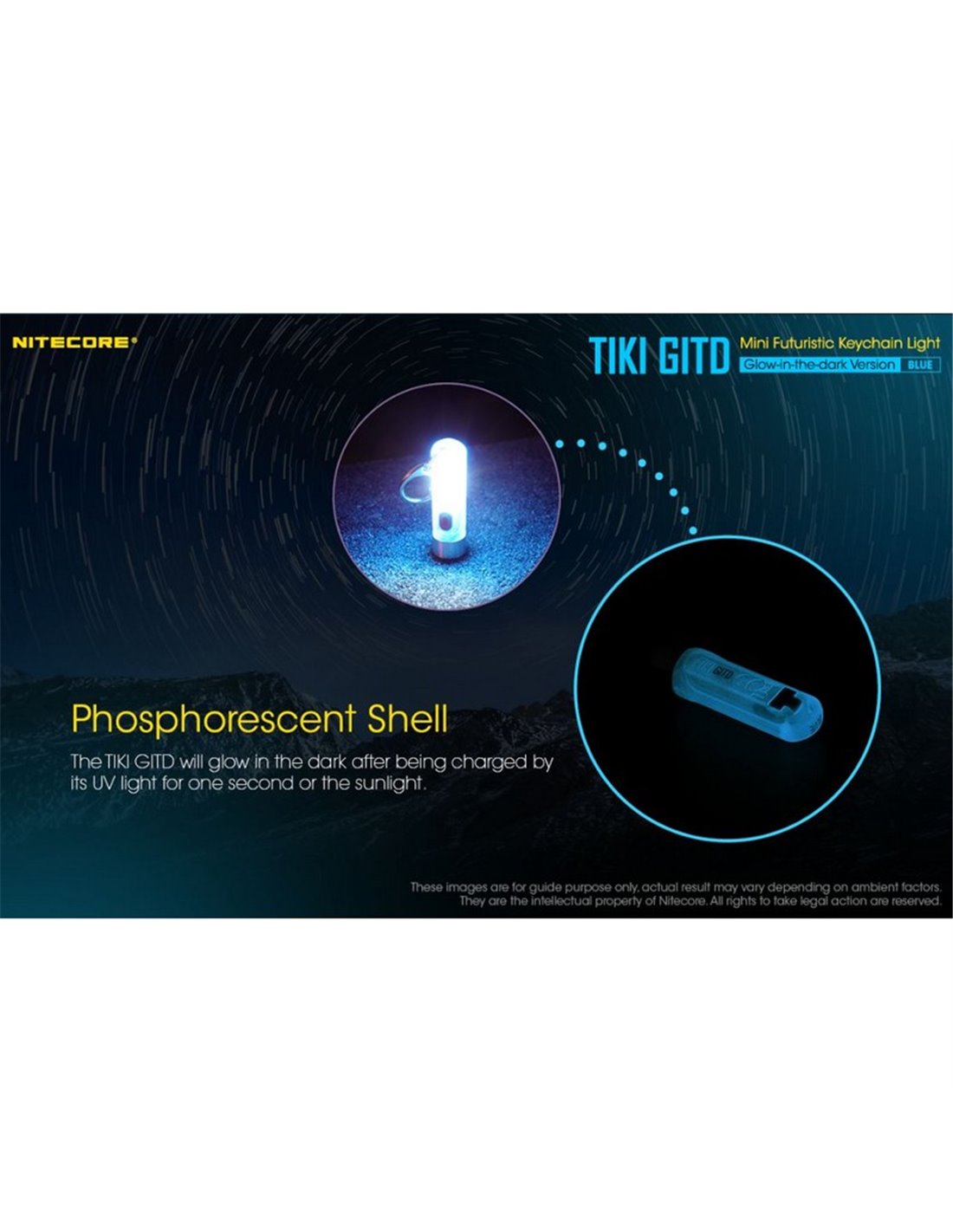 A Nitecore TIKI GITD BLUE é uma lanterna tipo chaveiro ultraleve e recarregável que se destaca pelo seu original efeito luminescente azul , visível no escuro após exposição à luz. Com 300 lúmens de potência e 71 metros de alcance , é perfeito para uso diário, EDC, atividades ao ar livre ou emergências .
