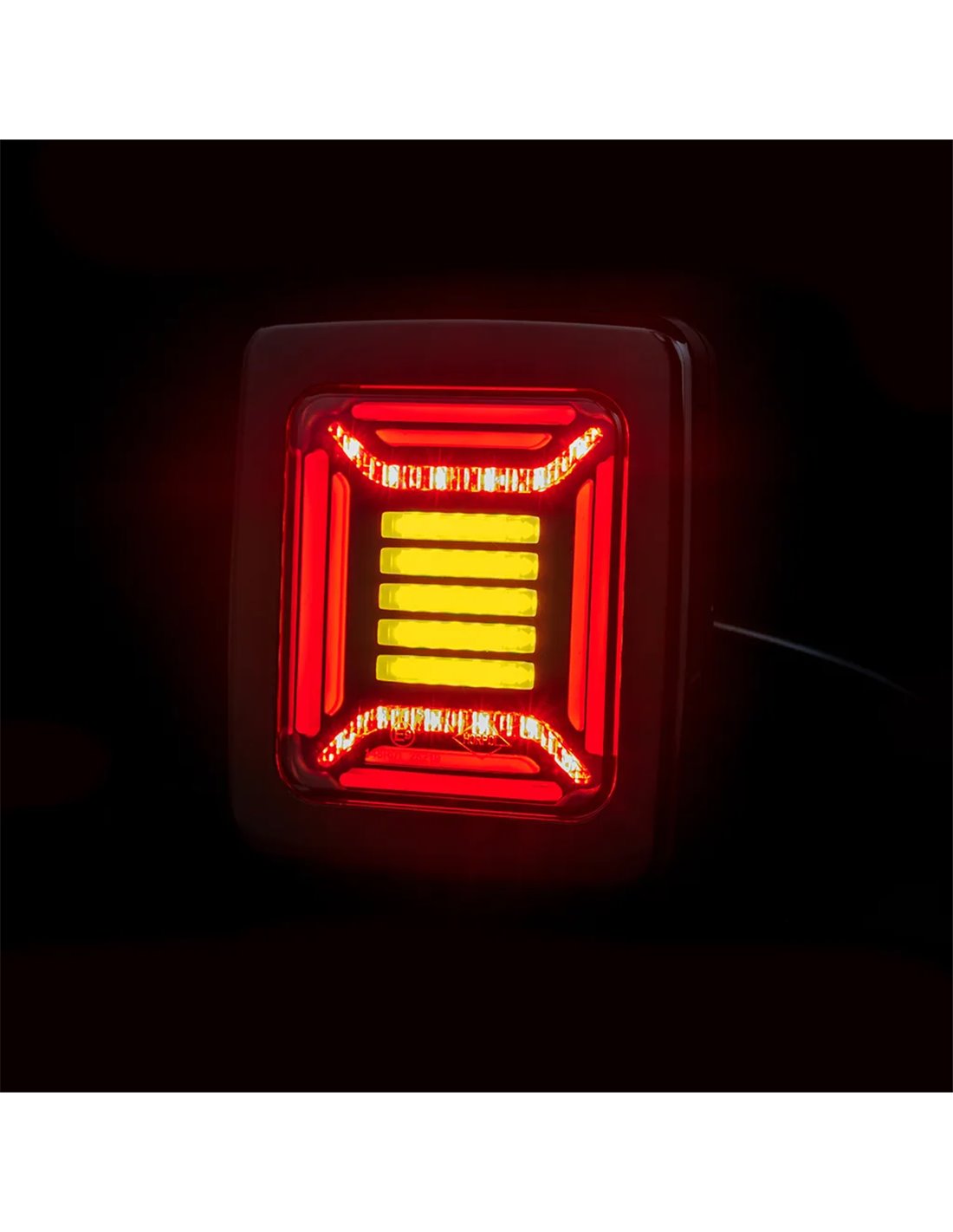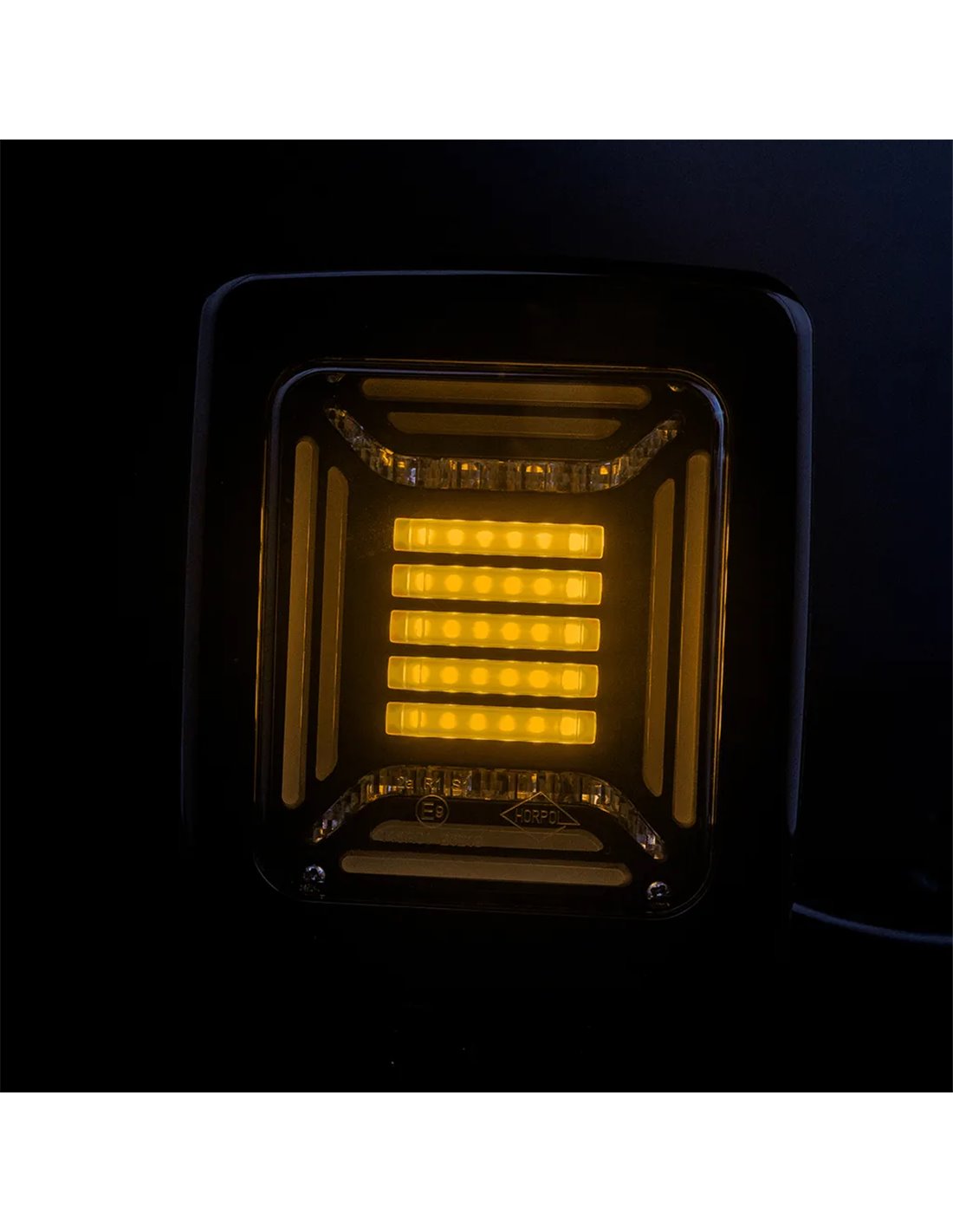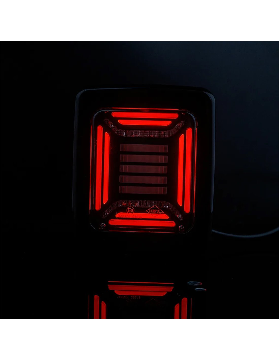 Esta lanterna traseira utiliza 98 LEDs para criar uma assinatura luminosa de alta definição. A luz de posição traseira emprega a tecnologia NEON, que gera uma luz uniforme e contínua, eliminando pontos de LED visíveis. A seta traseira possui uma opção de ativação suave; com um fio adicional (azul), é possível sincronizar várias luzes instaladas em linha para operar com um ritmo sequencial consistente.