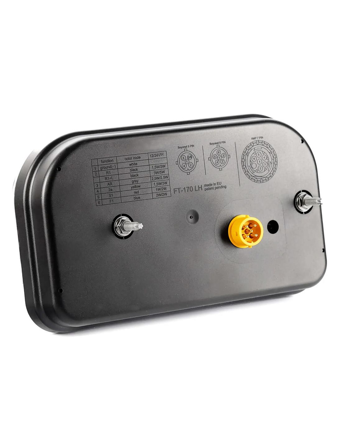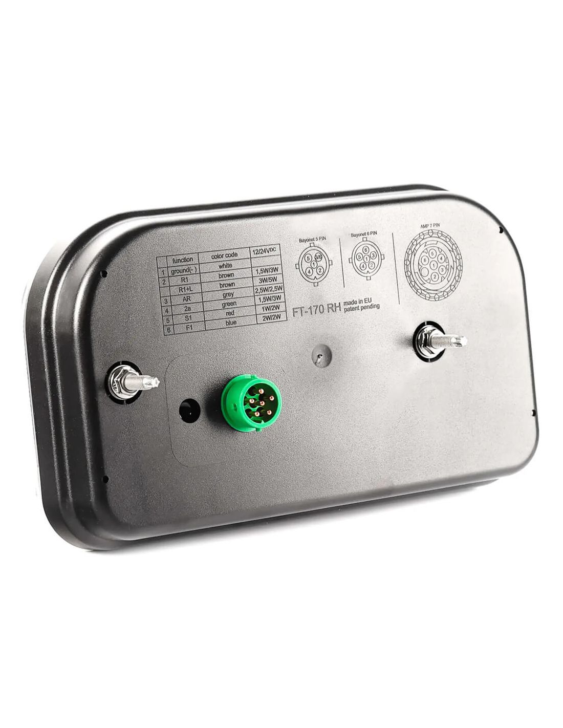 Lanterna traseira de LED da marca Fristom com triângulo refletor e conector traseiro de 5 pinos tipo baioneta , modelo FT-170, com 6 funções, compatível com 12V e 24V, totalmente submersível e homologada, com luz lateral para placa.