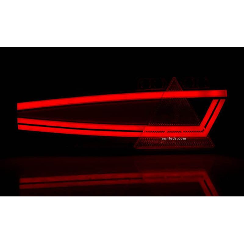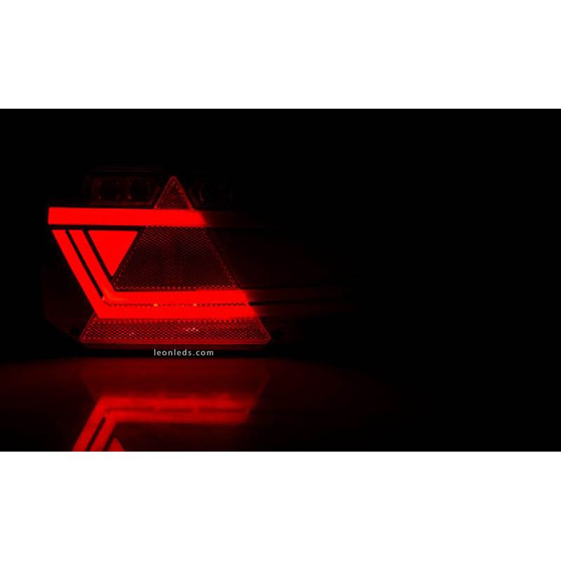 Lanterna traseira LED Mavic com triângulo para instalação na traseira de reboques ou plataformas. Este modelo é adequado para instalações de 12 e 24 V e inclui 1,5 metro de cabo de instalação. Possui 7 funções: luz de posição com efeito neon, luz de seta com efeito neon, luz de neblina, luz de ré, luz de freio com efeito neon e luz de marcação lateral com refletor.