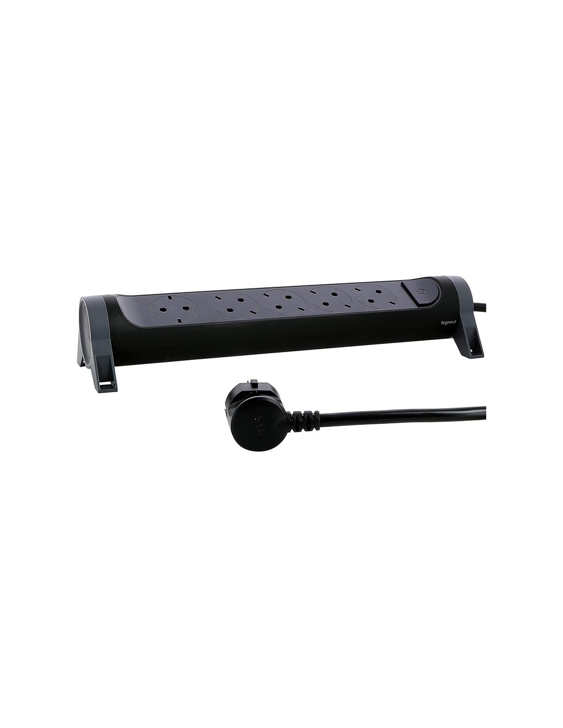Filtro de linha Legrand 2P+E com 5 tomadas e entrada frontal, uma a 90° para transformadores. Fixo e giratório, com interruptor liga/desliga iluminado. Cabo de 1,5 m com seção transversal de 1,5 mm². Para uso doméstico ou comercial.