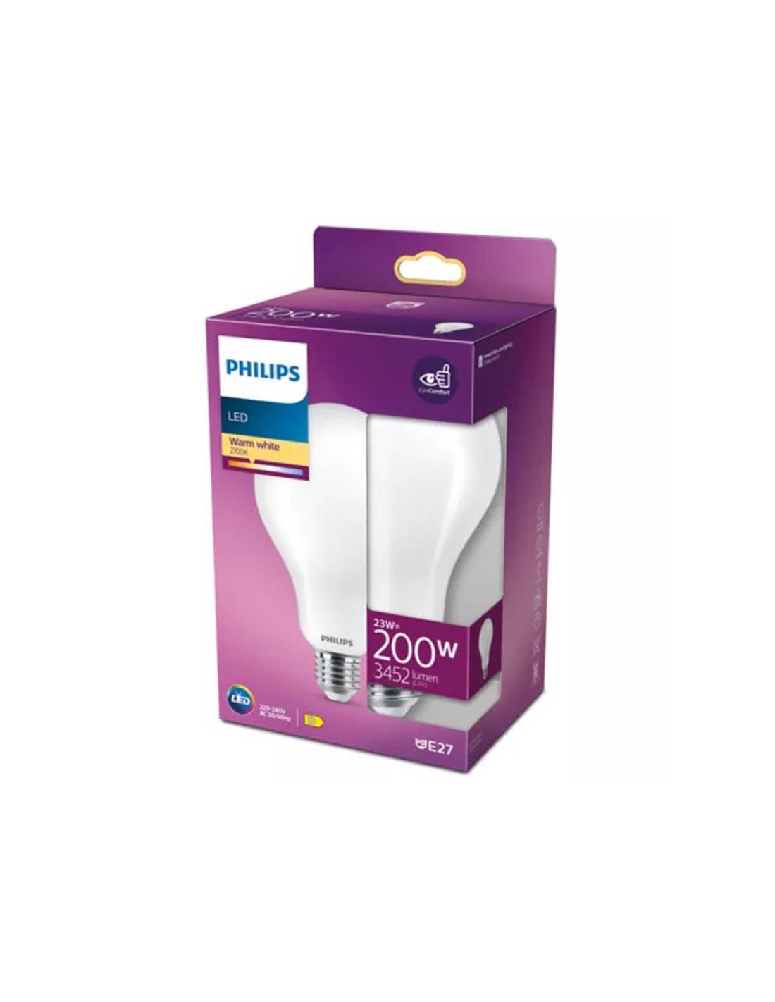 Lâmpada clássica LED E27 com uma potência de 23W equivalente a 200W de uma lâmpada incandescente convencional, com uma intensidade de 3.450Lm. Esta gama de lâmpadas LED Philips E27 oferece a mesma intensidade luminosa nos 3 tons de luz disponíveis: Branco Frio 6500K, Branco Natural 4000K e Branco Quente 2700K.