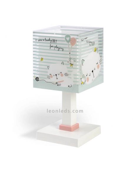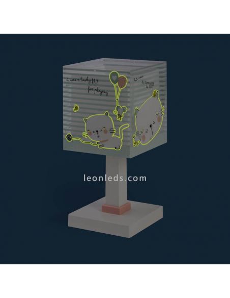 Lâmpada de superfície da nova série Dalber.Gato Amoroso, oferece um design infantil muito original. A estrutura desta lâmpada é branca com um detalhe na cor rosa na união da base e do corpo, a tela é quadrada decorada com, com linhas verdes, frases gatinho e camundongos. O contorno dos animais brilha nas trevas.