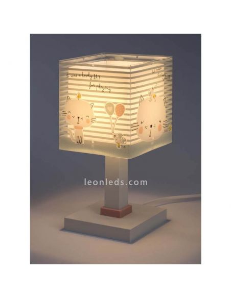 Candeeiro de mesa infantil da série Loving Cat com tela quadrada de polipropileno transparente, tem 29 cm de altura, 14 cm de largura e 14 cm de comprimento.