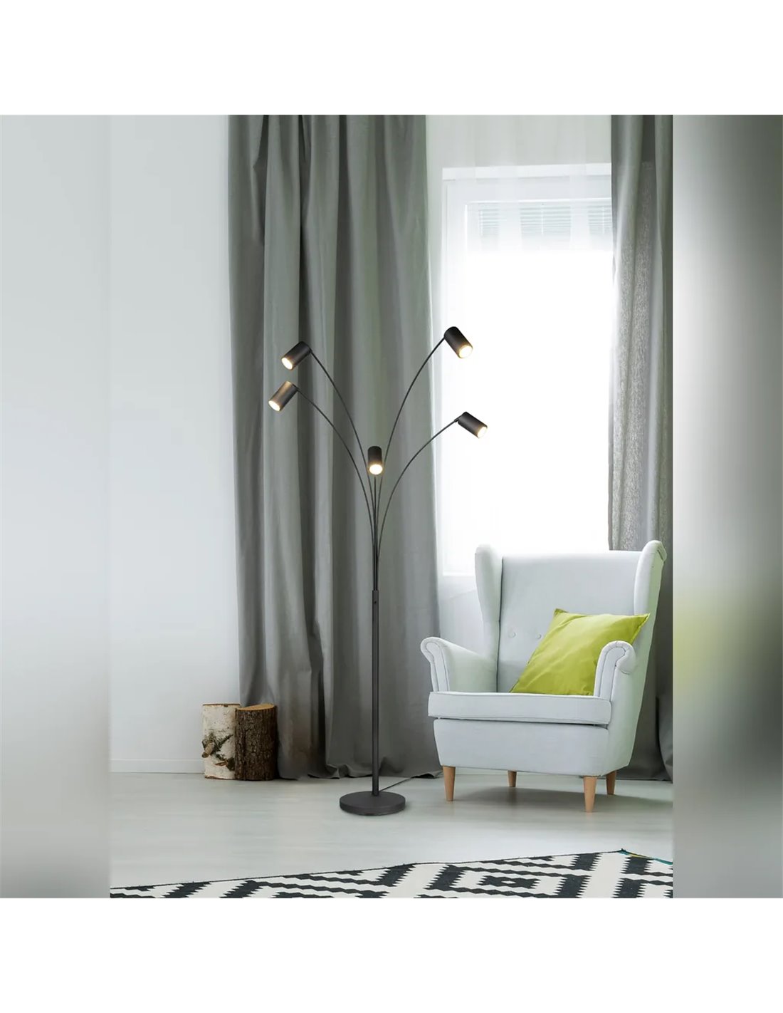 O candeeiro de pé MARLEY da TRIO Lighting combina design minimalista e funcionalidade para criar uma iluminação ambiente elegante em interiores. A sua estrutura arqueada com cinco focos ajustáveis permite direcionar a luz para diferentes pontos da divisão, proporcionando conforto visual e um efeito decorativo muito atraente.
