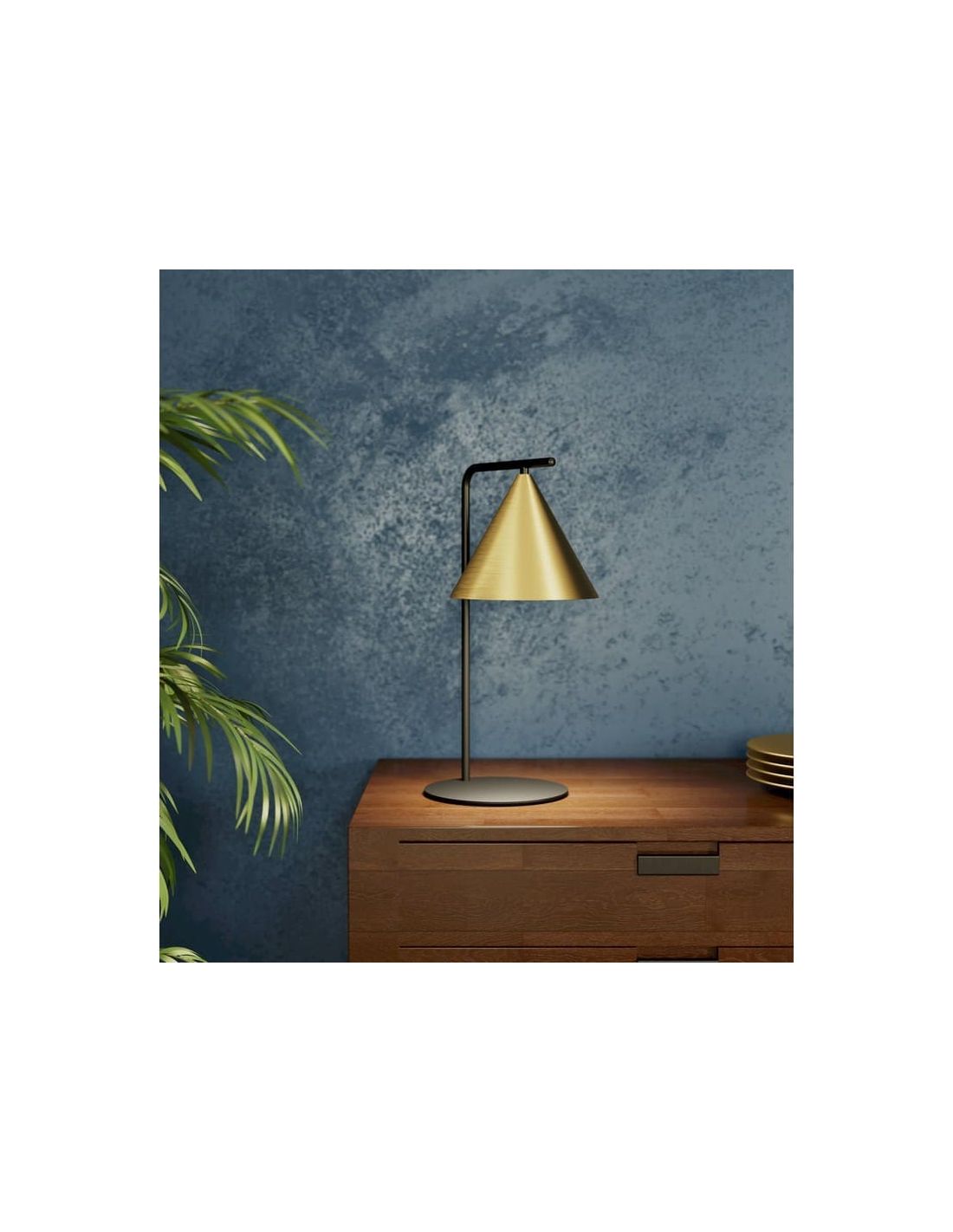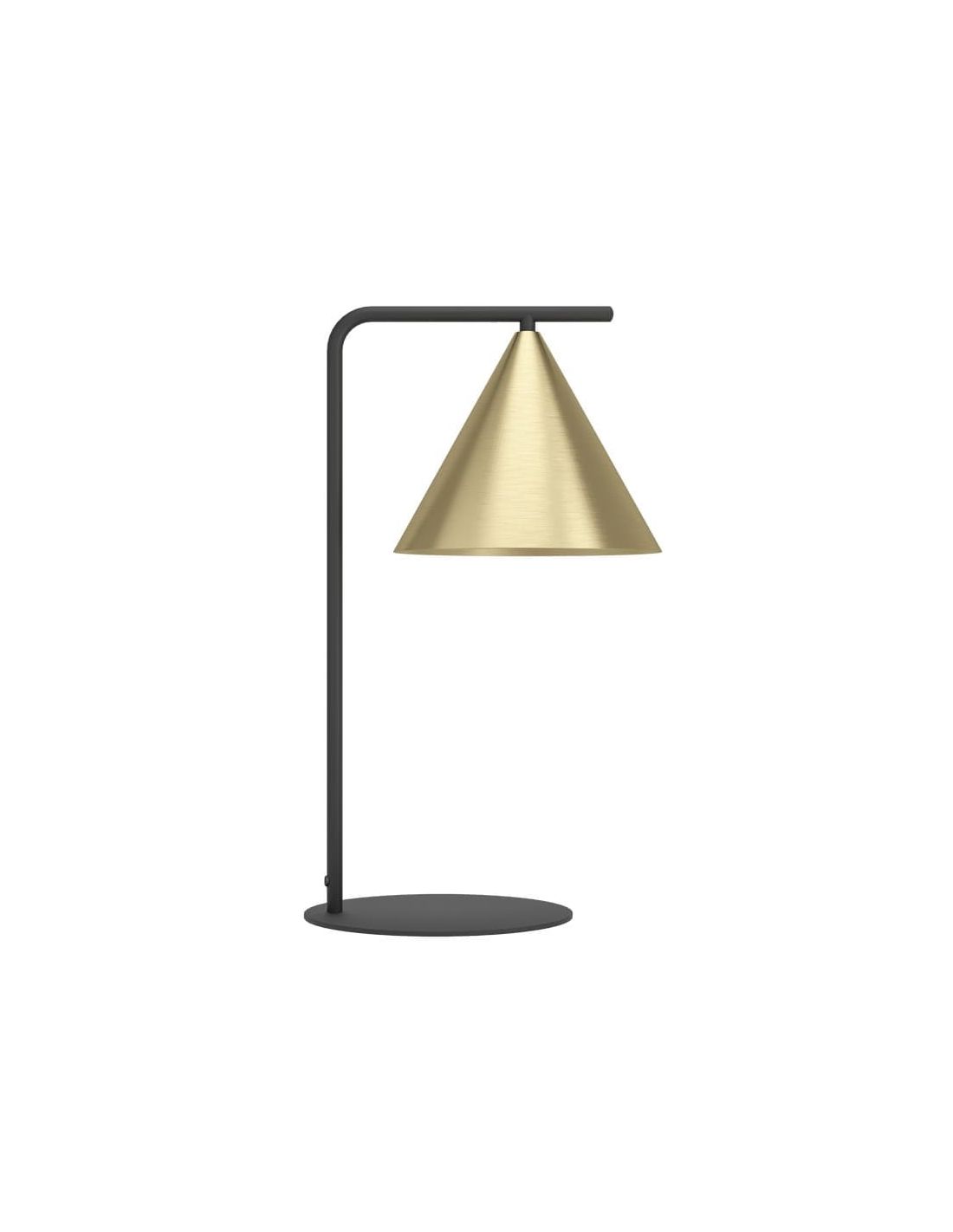 Luminária de mesa Eglo NARICES com base curva em metal preto e cúpula cônica em latão escovado com interior dourado . Um design nórdico elegante e versátil. Ideal para quartos, salas de estar, salas de jantar ou corredores. Compatível com lâmpadas E27 (não incluídas).
