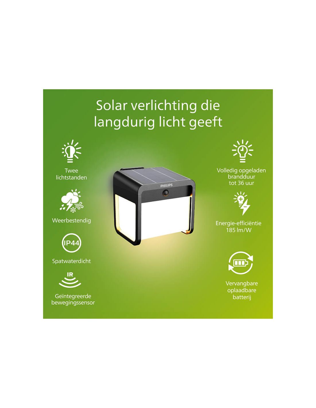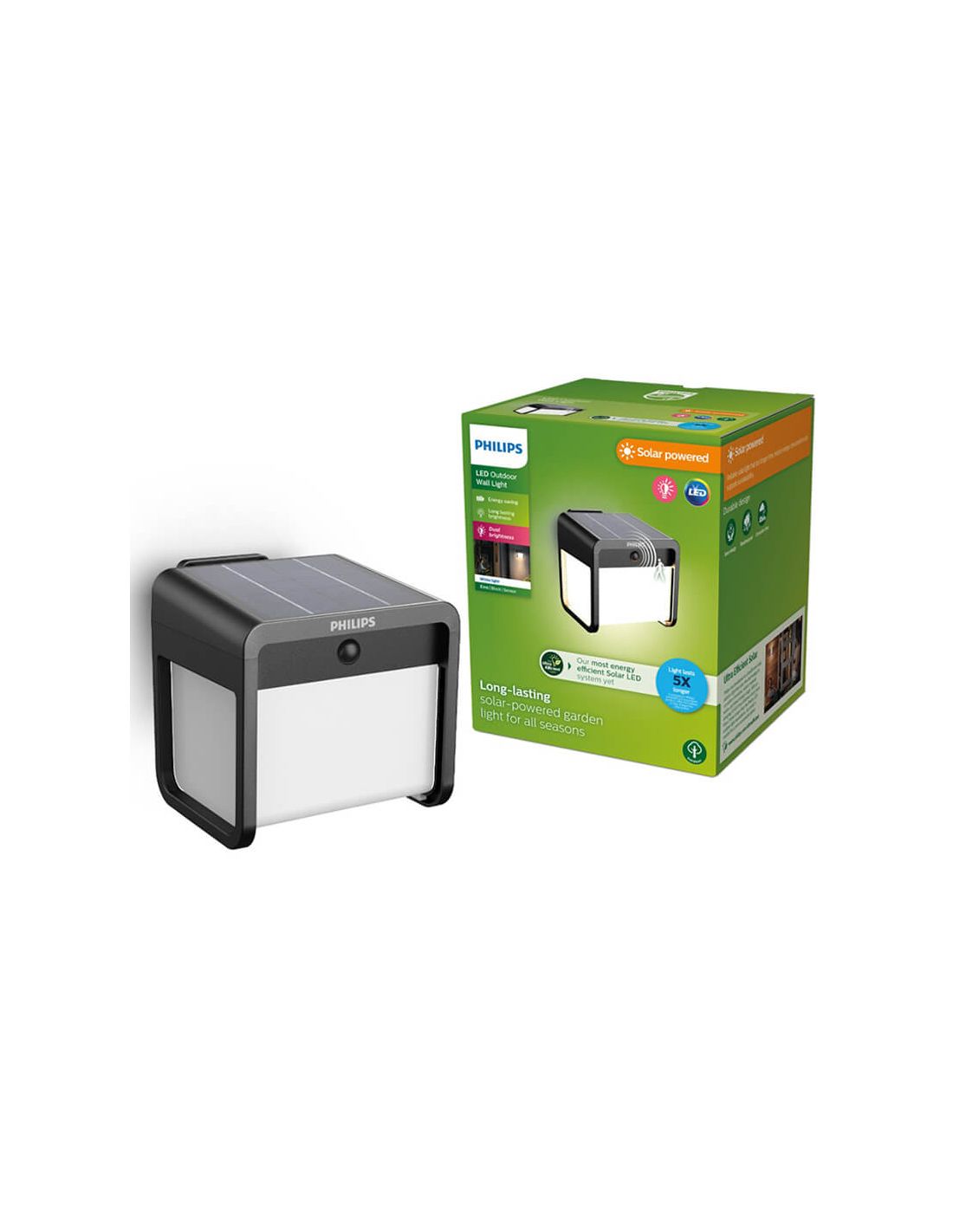 A luminária de parede LED solar Philips EZRA é uma solução moderna e eficiente para iluminação externa. Com um design compacto na cor preta, sensor de movimento integrado e energia solar, esta luminária de parede oferece segurança e praticidade, além de economizar energia. Sua luz suave de 3000K cria um ambiente aconchegante e elegante.