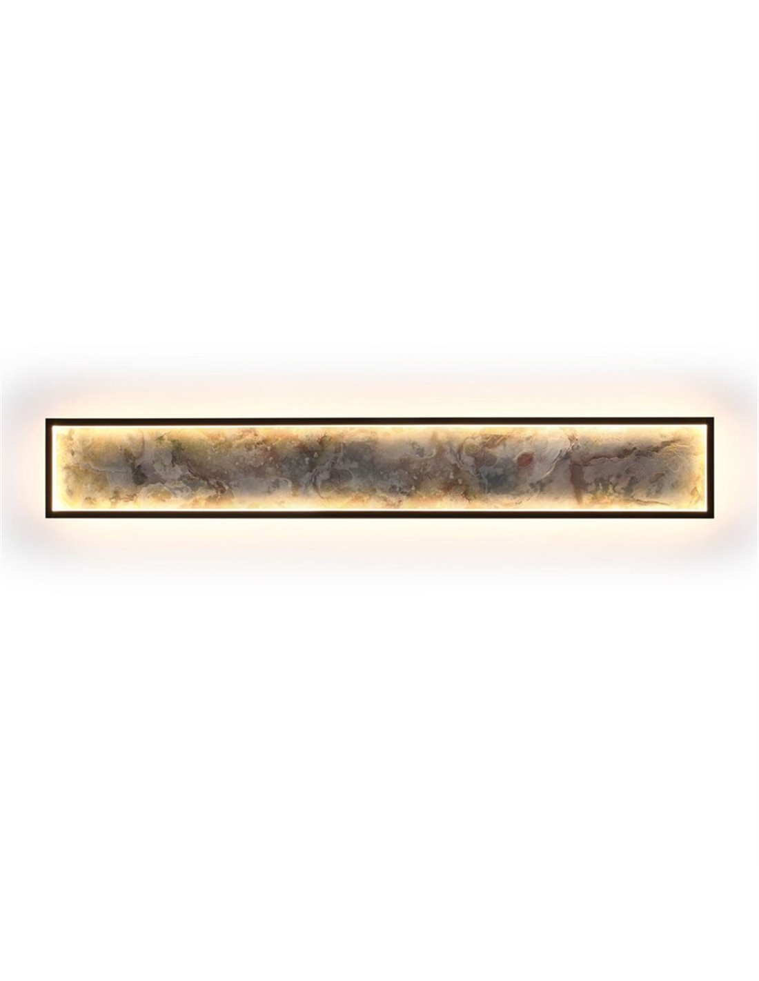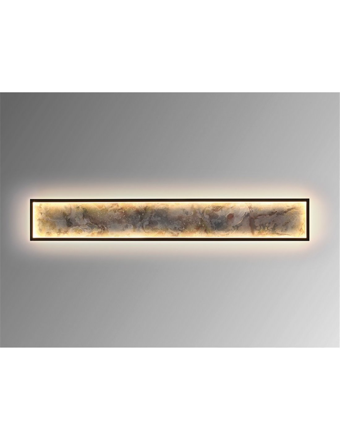 A luminária STONE é versátil e pode ser instalada como arandela ou plafon . Seu design retangular combina um acabamento preto fosco com uma superfície que imita ardósia em tons de cinza , proporcionando um estilo moderno e decorativo.