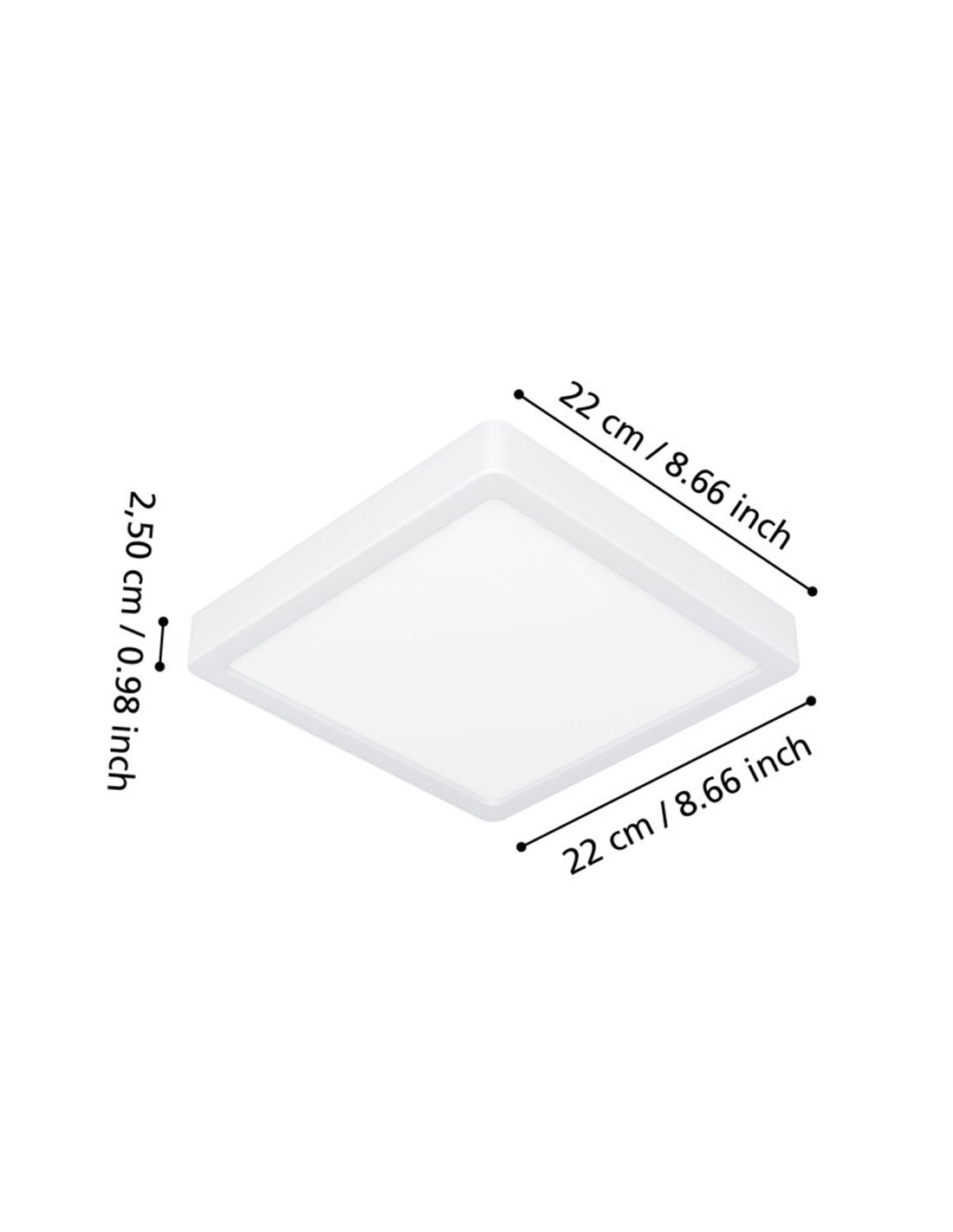 A luminária de teto LED quadrada branca FUEVA 6 de 220x220 mm, 10,5 W, 1200 lm, CCT (2700 K-4000 K-6500 K), IP44, para banheiro, pertence à série EGLO FUEVA 6, projetada para proporcionar iluminação segura em banheiros e cozinhas graças à sua classificação IP44 . Seu design ultraplano de 28 mm e difusor com acabamento acetinado garantem uma luz uniforme e sem reflexos .