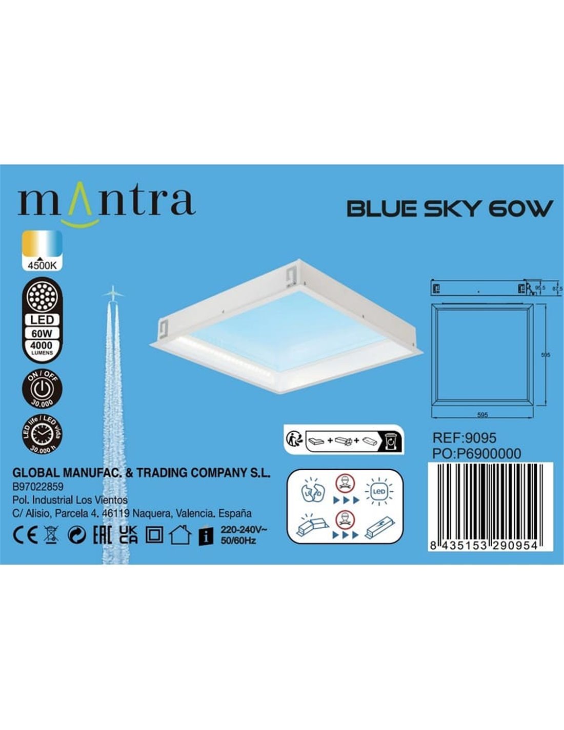 A luminária de teto LED BLUE SKY 60x60 é uma luminária embutida que reproduz o efeito visual de uma claraboia com céu azul , ideal para grandes espaços internos. Ela oferece 60 W de potência e 4.000 lúmens em uma cor neutra de 4.200 K.