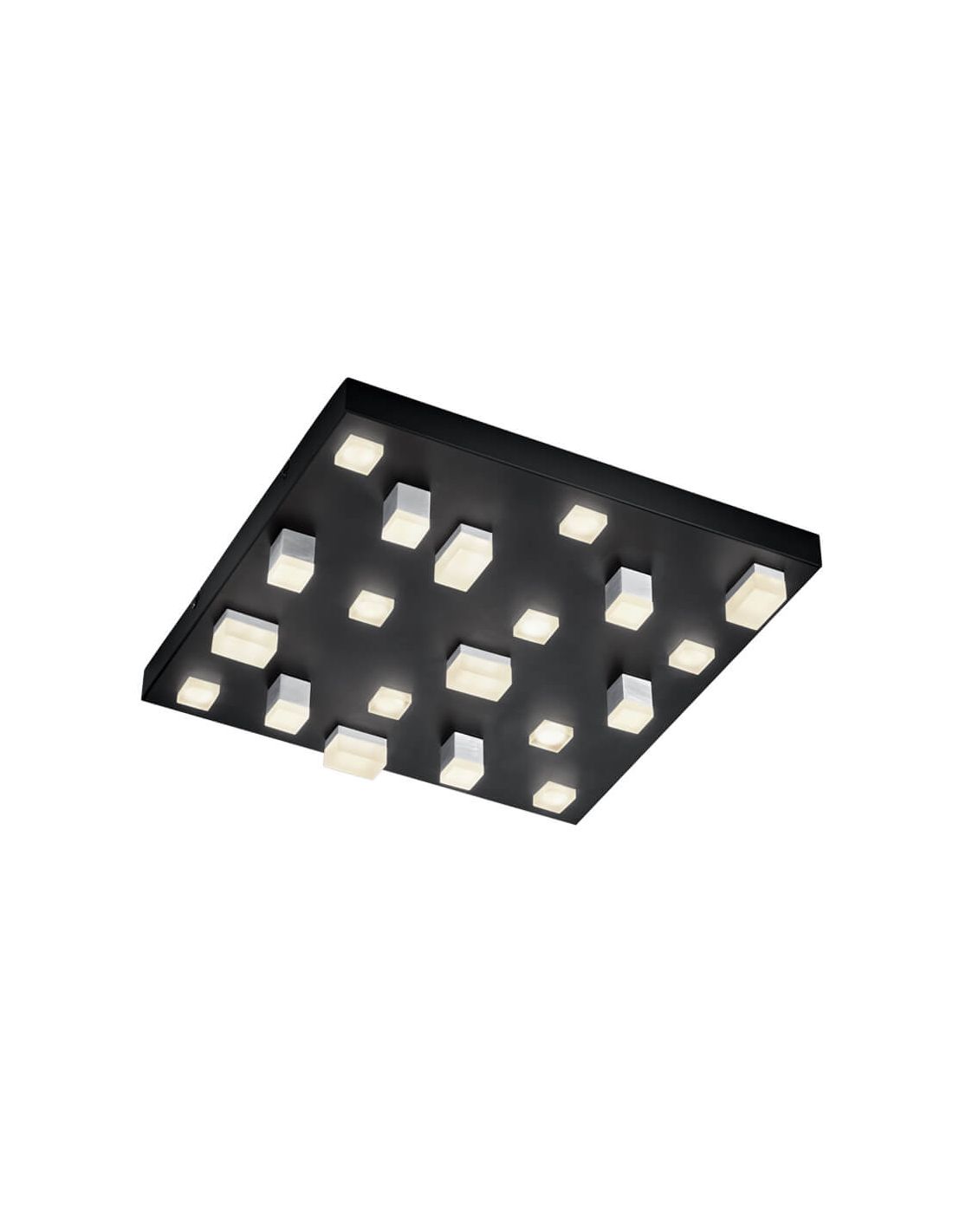 Luminária de teto LED Civeto preta regulável, 20 x 320 lm, da Cinque Lighting . Possui um suporte de teto quadrado com 20 cubos de alturas variadas que contêm as fontes de luz e conferem relevo à luminária.