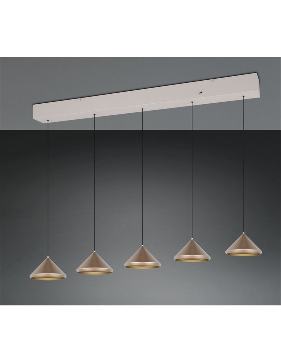 A luminária de teto LED LAGUNA de 5 luzes com acabamento em cobre marrom combina elegância e funcionalidade em um único design. Sua estrutura metálica em tons quentes e altura ajustável a tornam a escolha ideal para salas de estar espaçosas ou salas de jantar contemporâneas.