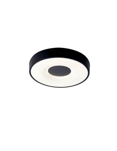 Esta luminária de teto LED tipo moeda preta apresenta um design circular simples que consiste em um difusor circular integrado à própria luminária de teto, juntamente com outro círculo central preto menor e um contorno externo da mesma cor que delimita a luminária de teto.