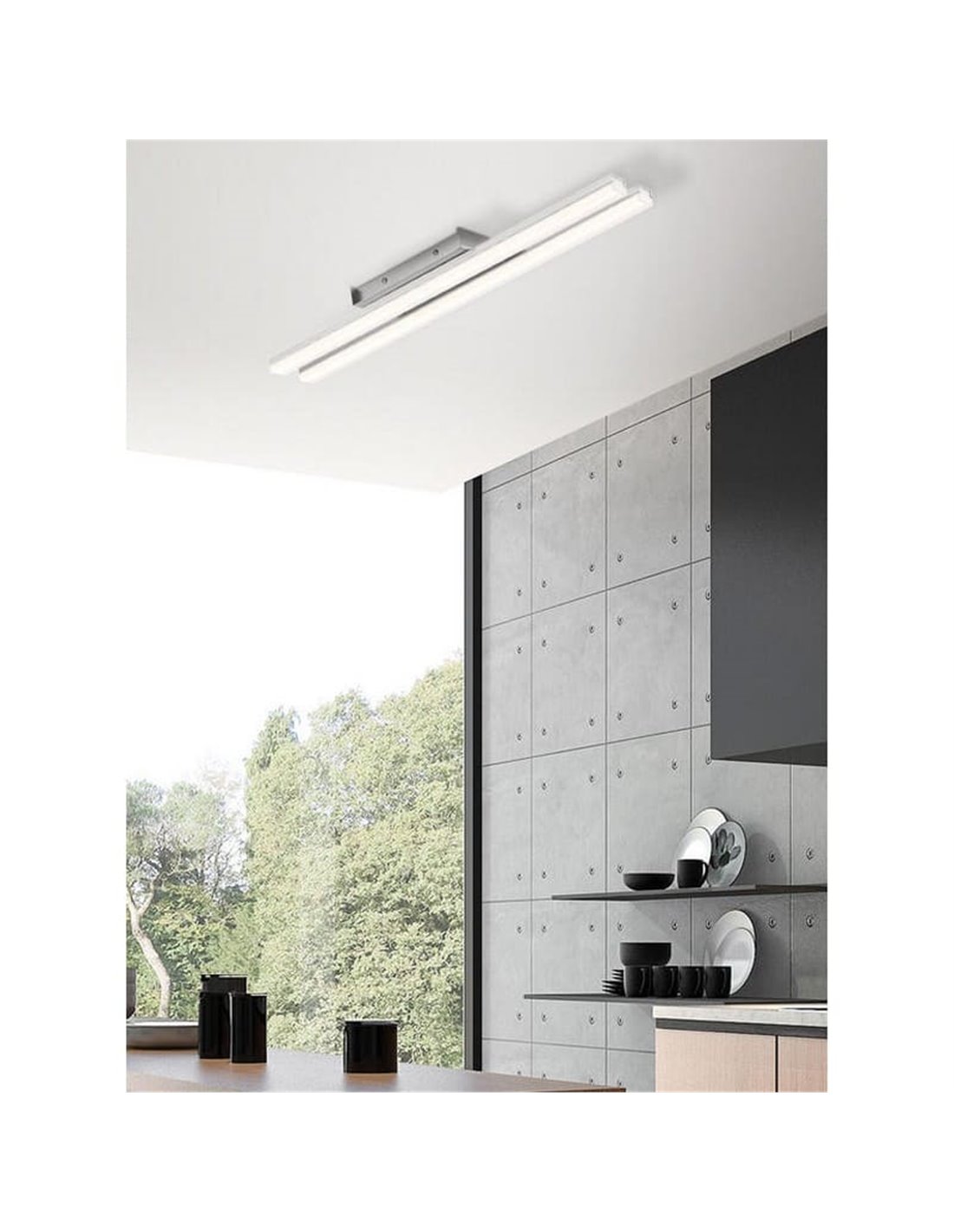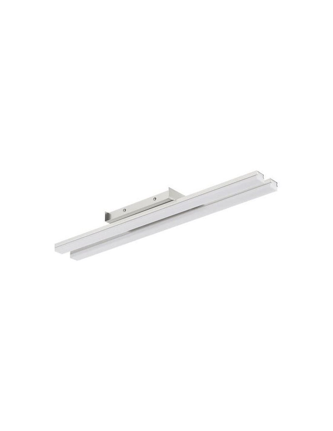 A luminária de teto LED KUSI 2x16W de 60cm é uma solução compacta e linear para iluminar ambientes pequenos com um estilo contemporâneo. Seu acabamento cromado fosco e dois perfis de LED paralelos fazem desta luminária um ponto focal discreto e moderno, ideal para tetos baixos.