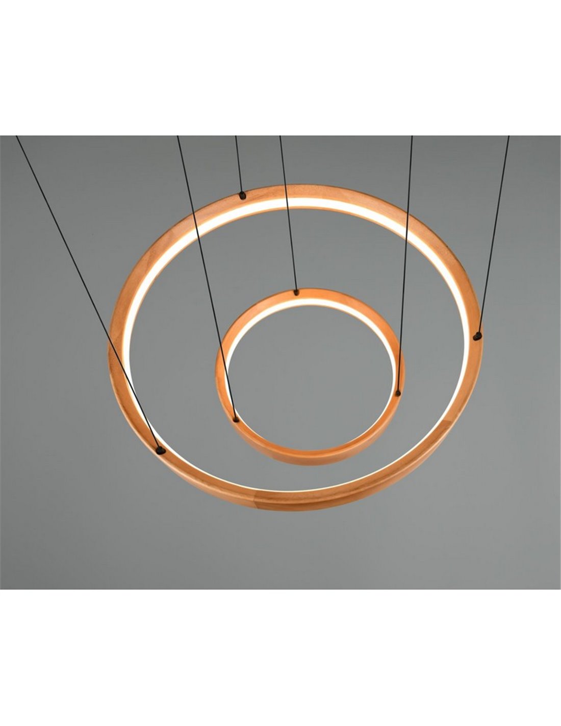 Luminária de teto LED LYNWOOD , feita de madeira natural , com duas luzes , 37 W de potência e 4300 lúmens . Oferece uma luz suave de 3000 K , com altura ajustável e dimerização por interruptor. Design moderno com 60 cm de diâmetro para interiores aconchegantes.