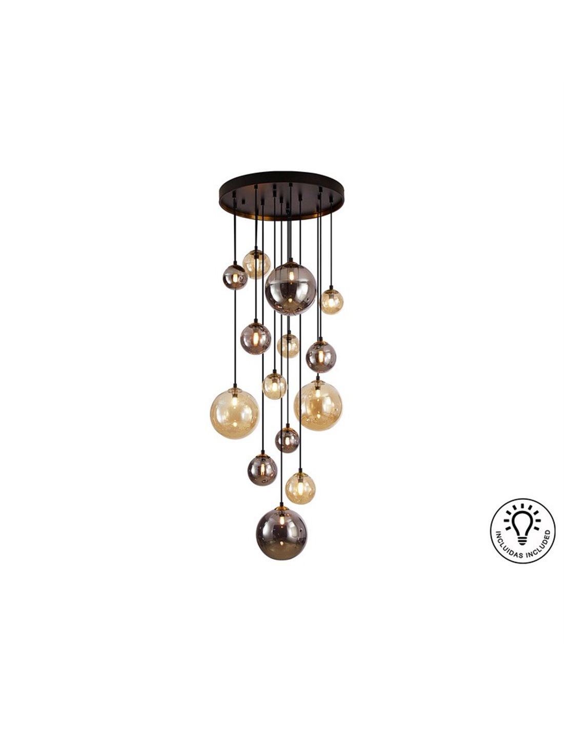 A luminária DARK de 14 luzes é uma peça decorativa concebida para se destacar em ambientes amplos. Sua estrutura preta fosca combina com detalhes em latão acetinado e uma composição de cúpulas esféricas em vidro âmbar e cinza fumê, criando um efeito visual elegante e contemporâneo.