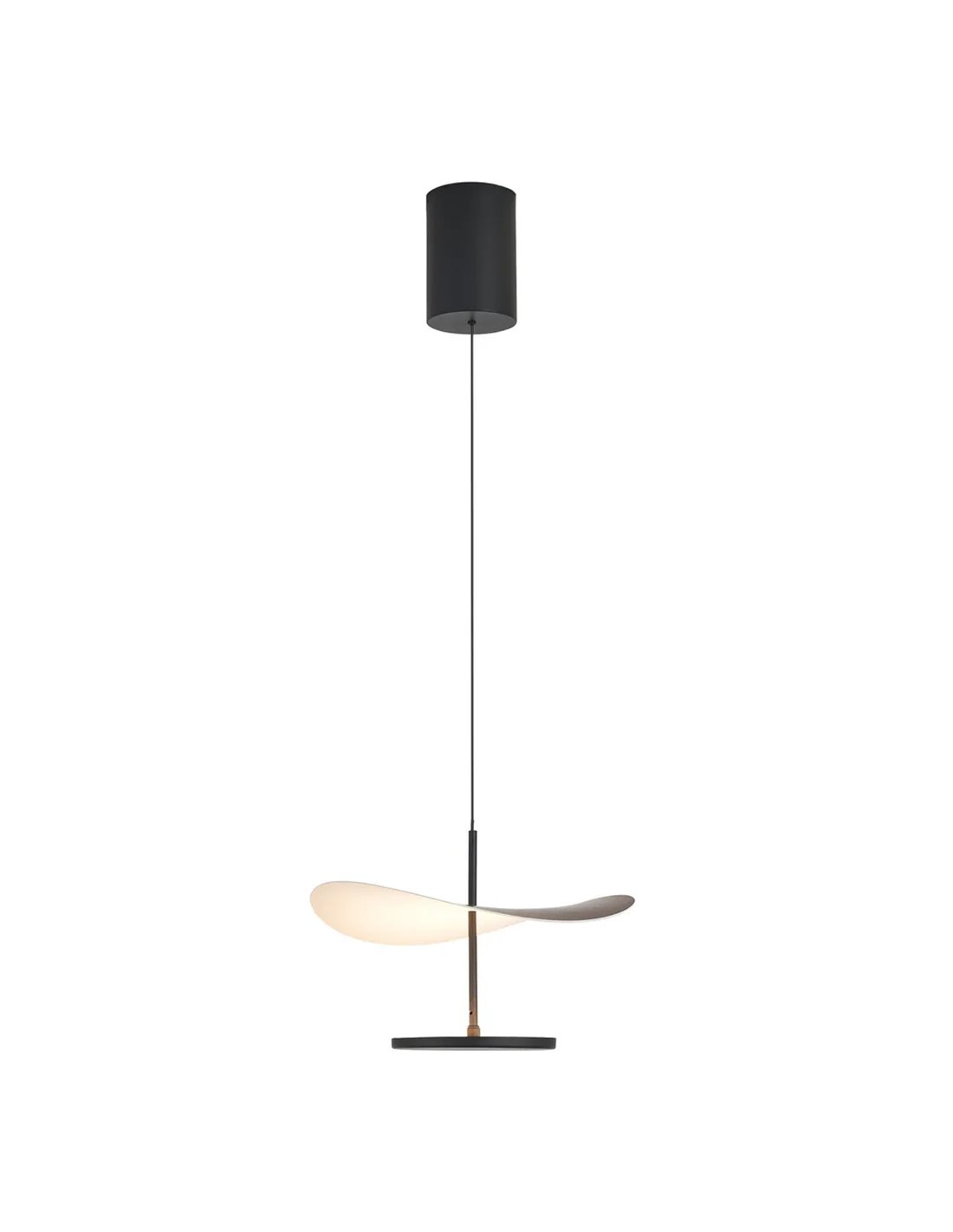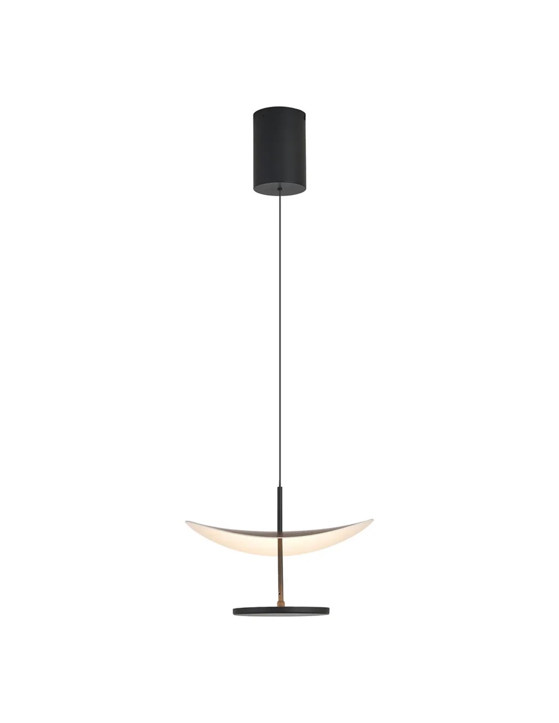 A luminária pendente ABISAL 12W LED destaca-se pelo seu design moderno e minimalista, combinando uma estrutura preta com um difusor curvo com acabamento imitando madeira. Seu diâmetro compacto de 30 cm a torna a escolha perfeita para espaços menores ou composições decorativas.