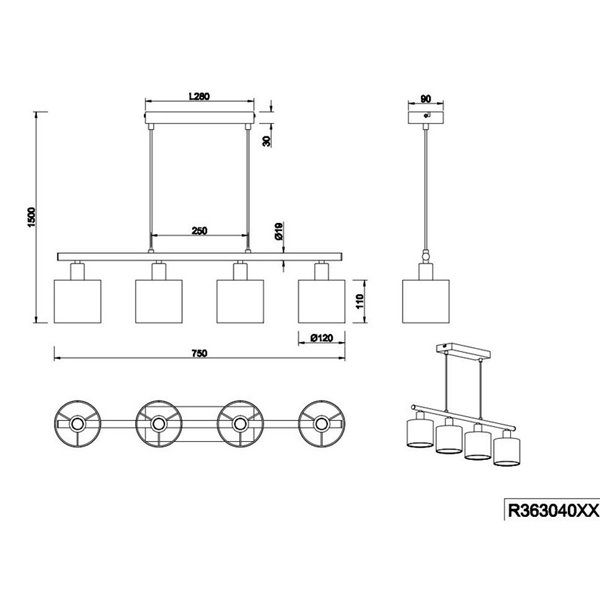 O pendente JASON com 4 cúpulas de vidro e altura ajustável oferece um design elegante e moderno. Compatível com 4 lâmpadas E14 de até 10W (não inclusas), é ideal para salas de estar, salas de jantar ou cozinhas. Certificação IP20 .