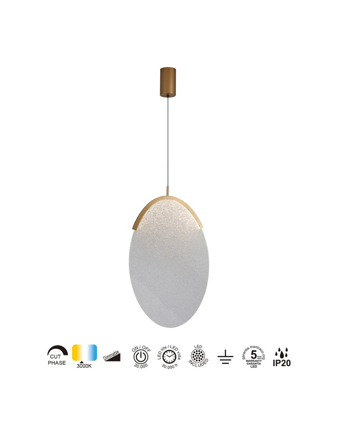 Luminária pendente LED oval dourada OASIS 12W, Ø39 cm, TRIAC dimerizável 3000K, 420 lúmens