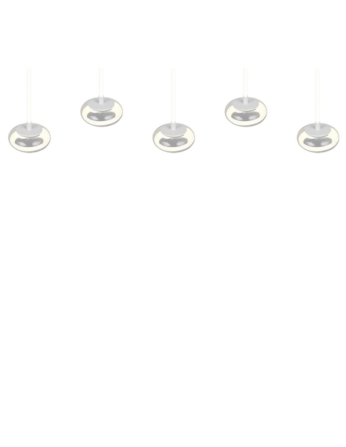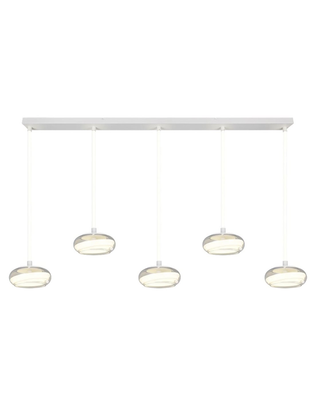 A luminária pendente TARSIA LED destaca-se pelo seu design elegante e linear, ideal para iluminar mesas de jantar, ilhas de cozinha ou grandes espaços . O seu acabamento branco e a estrutura esbelta de 162 cm de comprimento conferem uma estética moderna e arejada que se integra perfeitamente em ambientes contemporâneos.