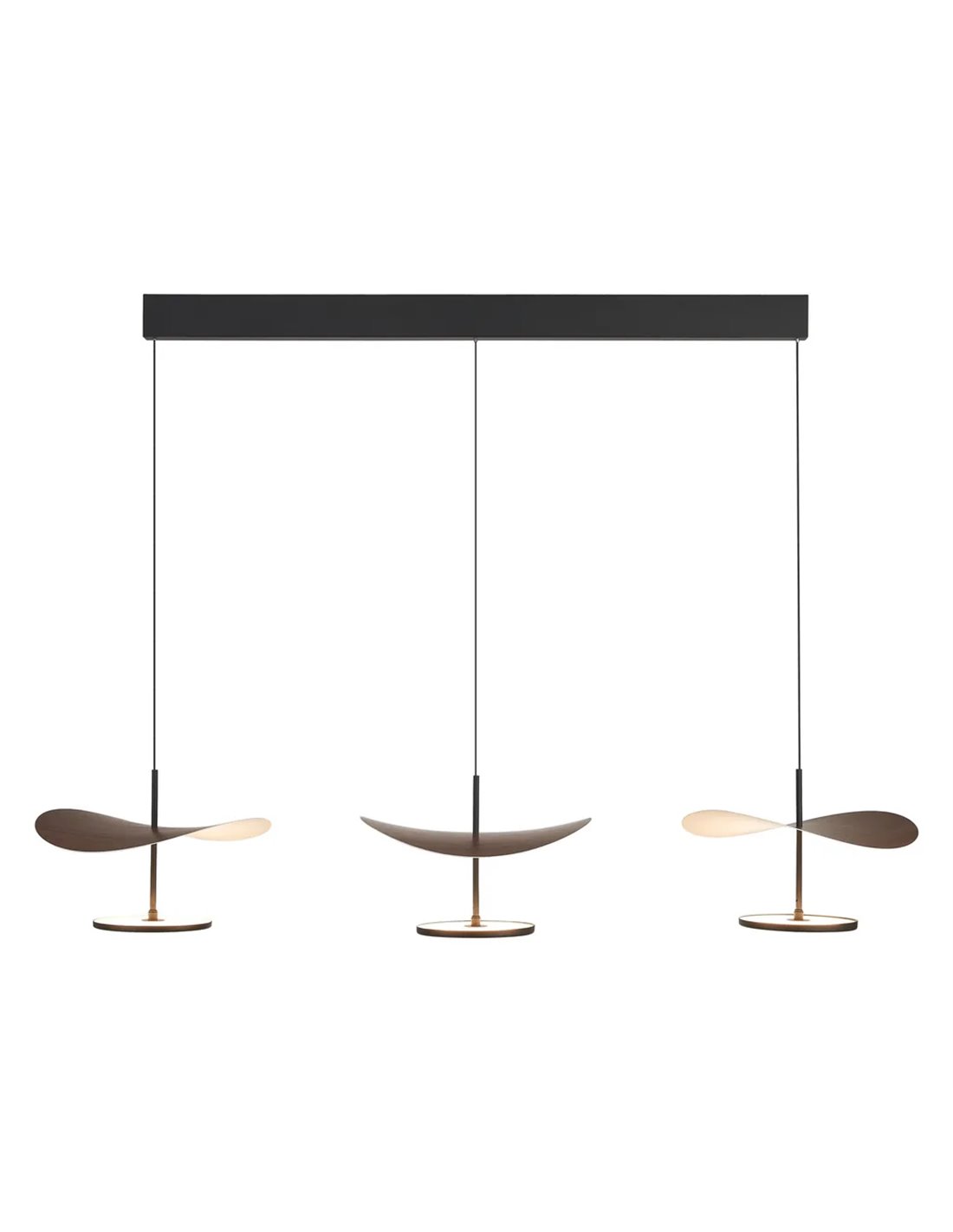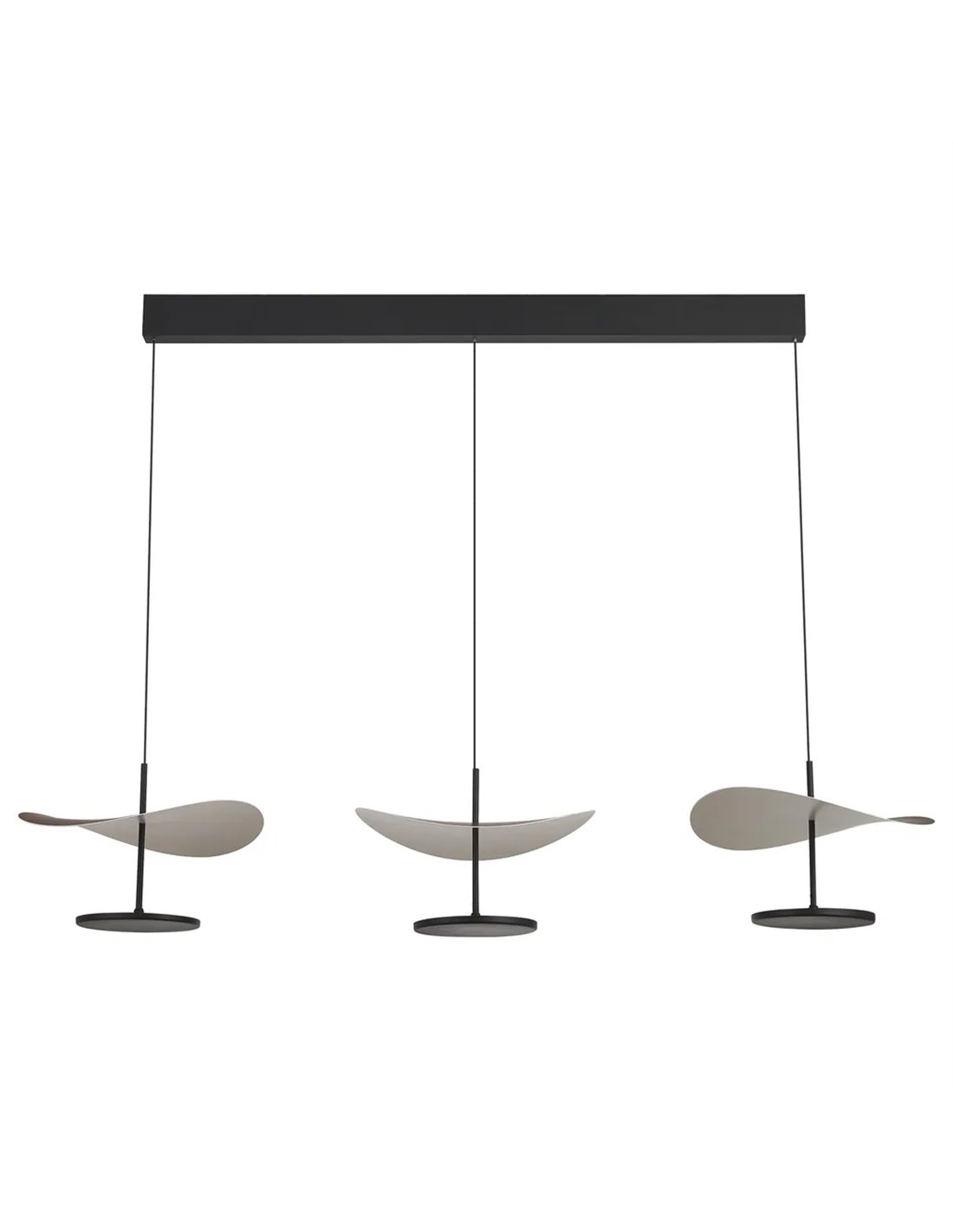 A luminária pendente ABISAL de 3 luzes e 32W LED destaca-se pelo seu design linear de 110 cm , ideal para iluminar superfícies alongadas como mesas de jantar, bares ou ilhas de cozinha. Seu design combina linhas pretas minimalistas com superfícies curvas com efeito madeira, criando um estilo contemporâneo e decorativo.