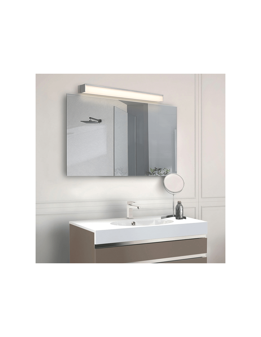 A luz de parede Tavi em acabamento cromado com difusor transparente, funciona com tecnologia LED 18W integrada para proporcionar uma temperatura de cor quente, eficaz e eficiente de 3.000K com um fluxo de 1.500 lúmens. Isto permite-lhe desfrutar de uma atmosfera que aumenta a sua sensação de bem-estar enquanto dá à sua casa de banho um aspecto refrescante.
