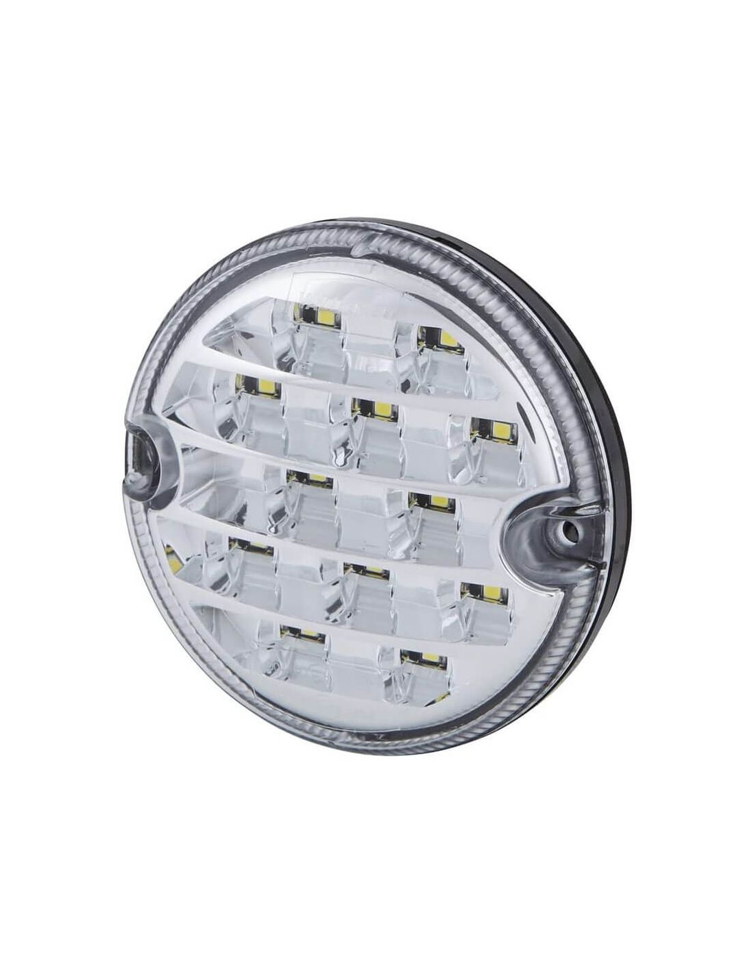 Luz de ré HELLA VALUEFIT LED, Ø95 mm , adequada para 12 V e 24 V , com 12 LEDs , consumo de apenas 1,5 W , carcaça preta e lente transparente. Montagem traseira com dois pontos de fixação e cabo de 260 mm com extremidades abertas. Certificação ECE R10/R23 , com proteção IP67 .
