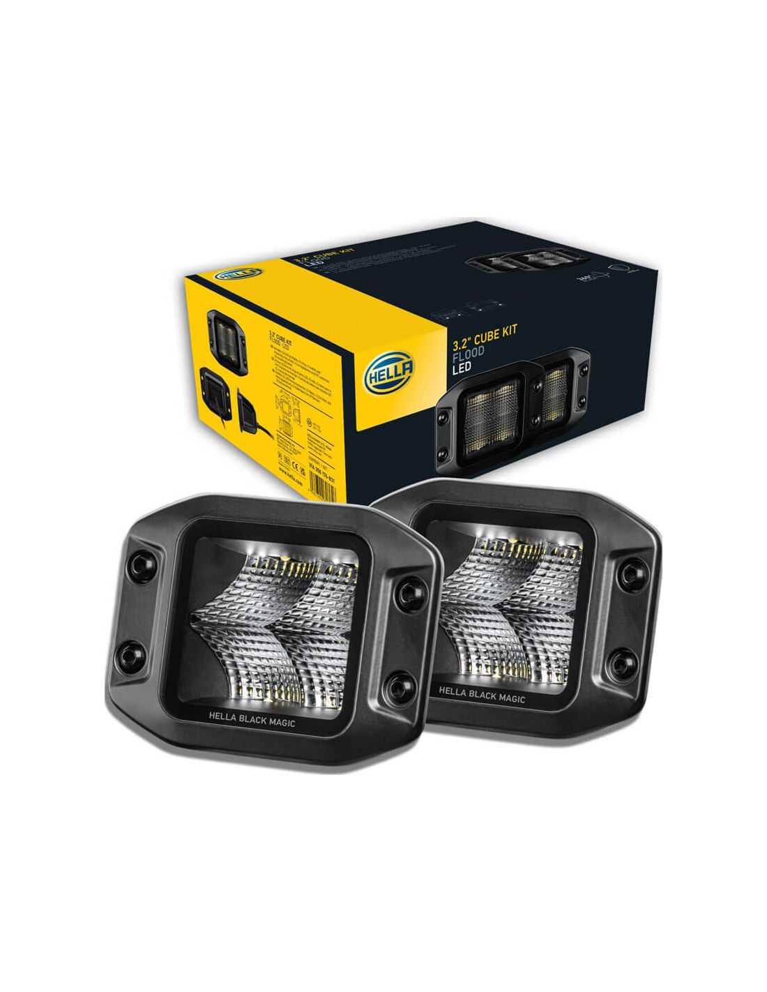 Pack 2 unidades de faróis LED embutidos quadrados Hella Black Magic Cube de 3,2". Esses faróis LED têm uma potência de 3.000 Lm com um consumo de 40W, funcionam em tensões de 10V a 30V e a ótica é de amplo campo.
