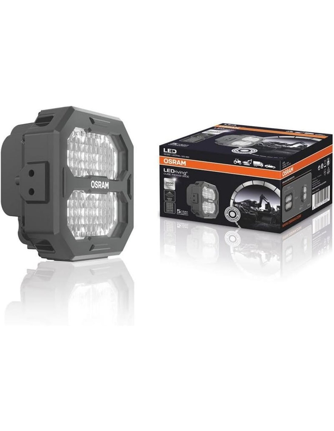 El faro LED OSRAM LEDPWL105-WD de la serie LEDriving CUBE PX3500 Wide está diseñado para quienes necesitan una iluminación eficaz en zonas de trabajo amplias. Gracias a su haz Wide, proyecta luz uniforme hasta 55 metros, ofreciendo un equilibrio perfecto entre amplitud y distancia.