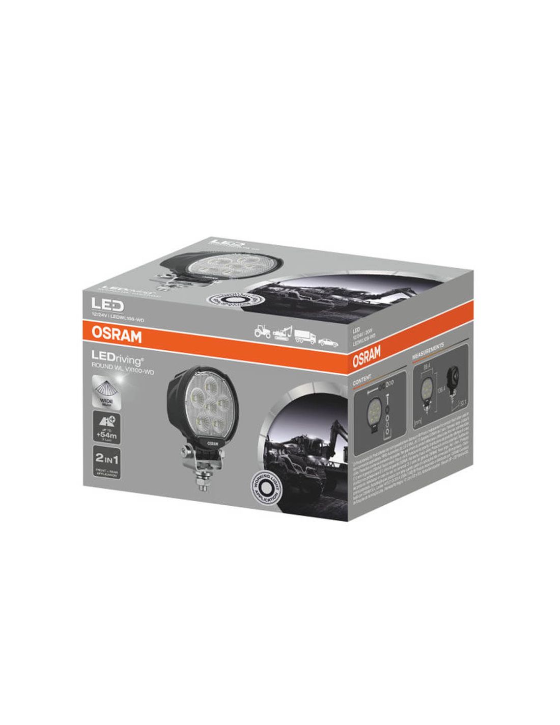 Farol LED redondo com óptica de trabalho 'Wide Beam', potência de 20W , intensidade luminosa máxima de 2.000Lm e tom de luz branca de 6000K , o novo farol LED redondo Osram VX100-WD atende a todos os padrões para este tipo de produto, seu a óptica de luz é de campo amplo, oferecendo um alcance de feixe de luz de mais de 56 metros de alcance. Este farol LED Osram Round VX100-WD LEDWL106-WD pode ser instalado em 12 Volts e 24 Volts e inclui tudo o que é necessário para ser instalado.