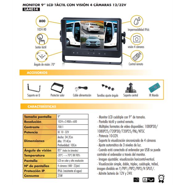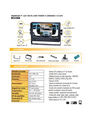 Monitor de ecrã táctil HD 1024 de alta resolução com 4 câmaras traseiras de visualização. Este monitor incorpora botões de toque para facilitar a operação, mas também pode ser utilizado com o controlo remoto incluído. Todos os acessórios necessários para a instalação estão incluídos na embalagem: cabo de alimentação, parafusos com ajuste de ângulo, pára-sol, U-bracket e suporte central.