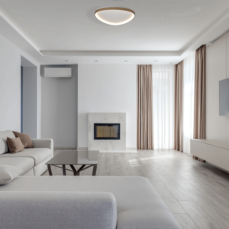 O aplique de teto LED dourado Niseko II de pequeno formato funciona com uma potência de 42 W e com tecnologia LED para fornecer uma temperatura de cor de 2.700 K-5.000 K com 2.500 lúmens. Seu tamanho é 6,1*42,1*42,1 cm.