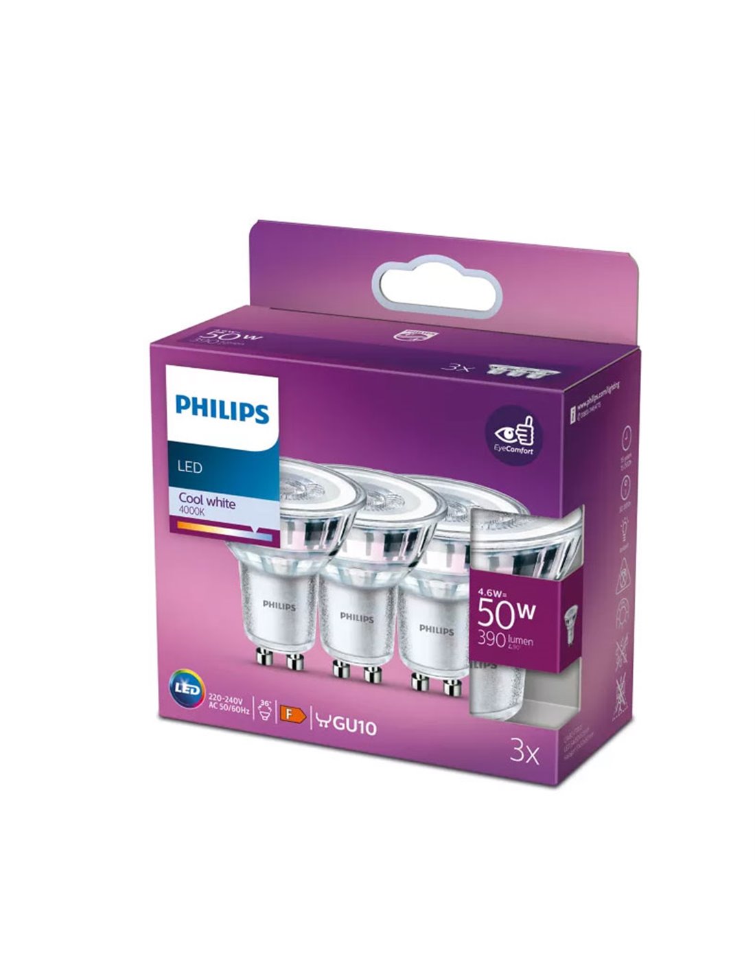 Pacote com 3 lâmpadas LED GU10 PAR16 Philips de 4,6 W (equivalente a 50 W ) com luz de 4000 K (branco neutro) e feixe de 36° . Cada lâmpada oferece aproximadamente 390 lm , acendimento instantâneo e tecnologia EyeComfort para uma iluminação agradável sem cintilação incômoda. Não regulável . Vida útil de 15.000 h e IRC 80. Formato PAR16 compacto (≈Ø50 × 54 mm) com soquete GU10 , substituição direta em holofotes embutidos ou de trilho. Ideal como um pacote de lâmpadas para cozinhas , banheiros , corredores ou áreas de trabalho , combinando clareza e economia de energia com a confiabilidade da Philips .
