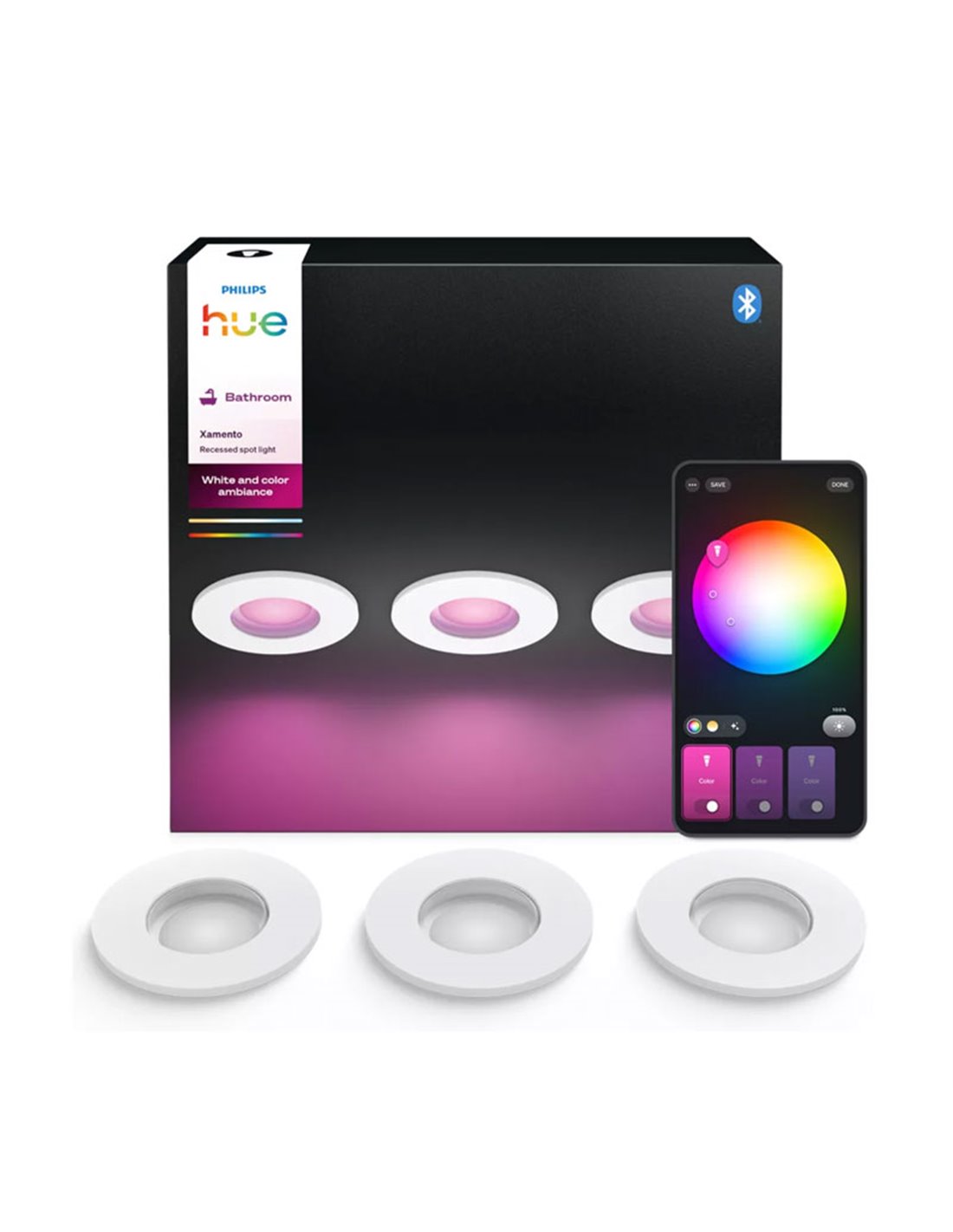O pacote inclui tudo o que você precisa para a instalação: três anéis de embutir Xamento e três lâmpadas Hue GU10 . Você pode controlá-los diretamente via Bluetooth ou integrar o sistema à sua casa inteligente com o Hue Bridge para acessar todos os recursos.