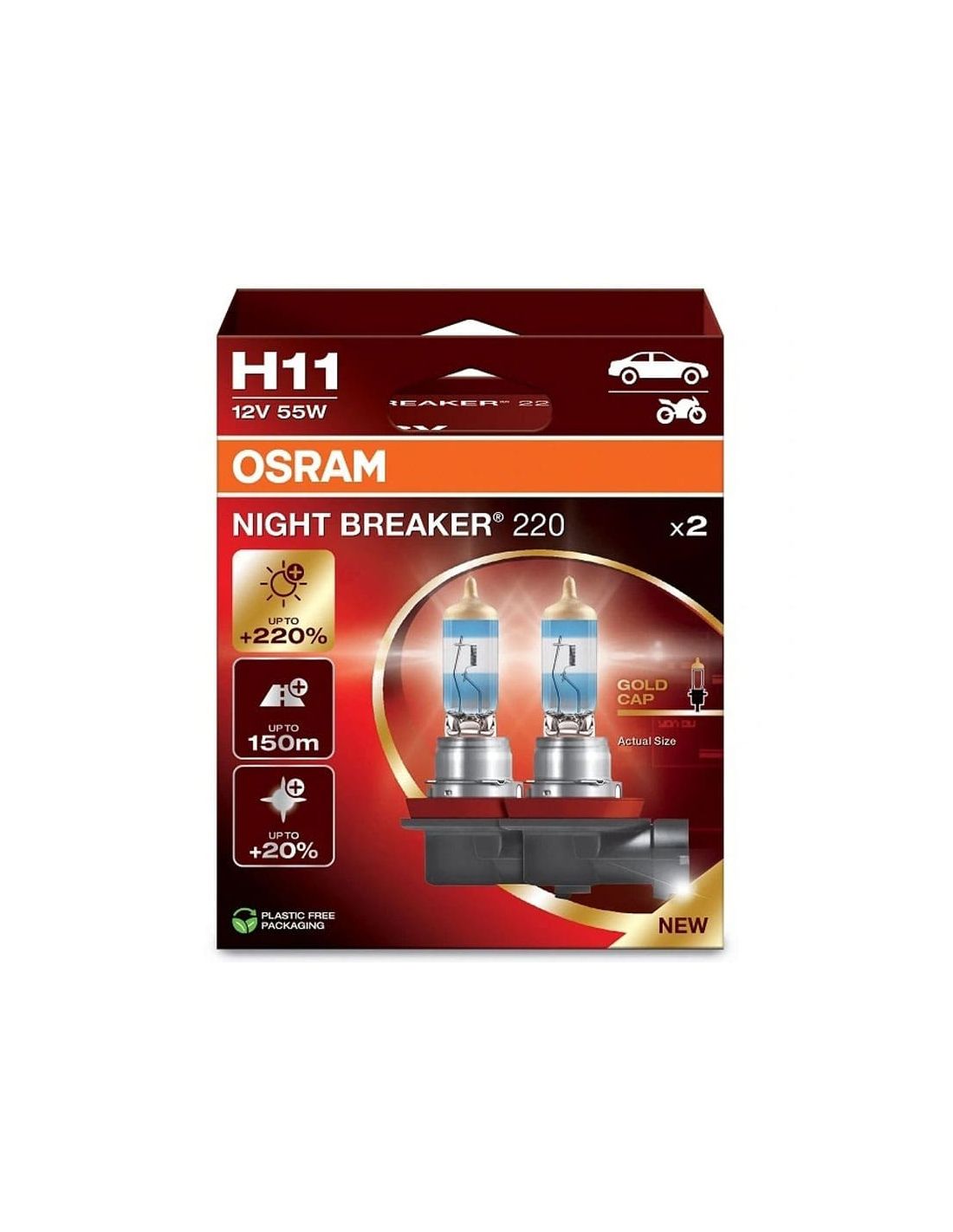 Pacote de 2 Lâmpadas Halógenas H11 Osram Night Breaker 220 (PGj19-2) para Veículos 12V com potência de 55W e 220% mais luz que uma Lâmpada Convencional e luz 20% mais branca, esta é a nova geração do Osram Night Breaker 220, seu o alcance do feixe de luz é de 150 metros.